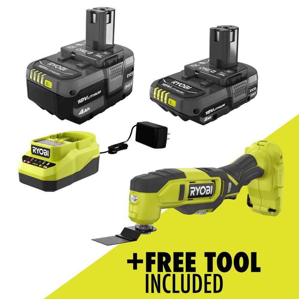 Boost your productivity with the versatile RYOBI ONE+ 18V Lithium-Ion Kit, featuring both 2.0 Ah and 4.0 Ah batteries, a fast charger, and the cordless multi-tool with the lowest vibration in its class. This set fits seamlessly into the RYOBI ONE+ System, offering extended runtimes and unmatched flexibility for handling a variety of materials with ease.