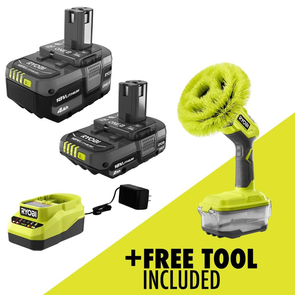 RYOBI ONE+ 18V Lithium-Ion Kit with 2.0 Ah and 4.0 Ah Batteries, Charger, and Free ONE+ 18V Cordless Power Scrubber