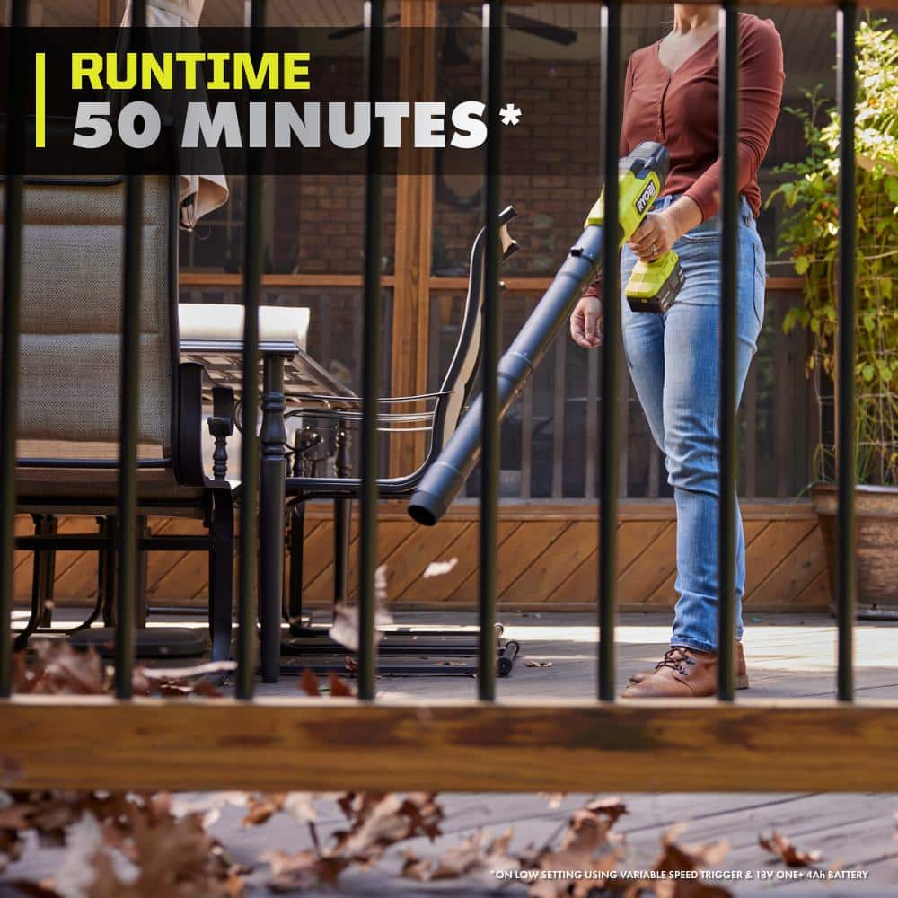 Q: How long does the blower run on a full battery? A: With an 18V ONE+ 4Ah battery, you can expect up to 50 minutes of runtime on the lowest setting.