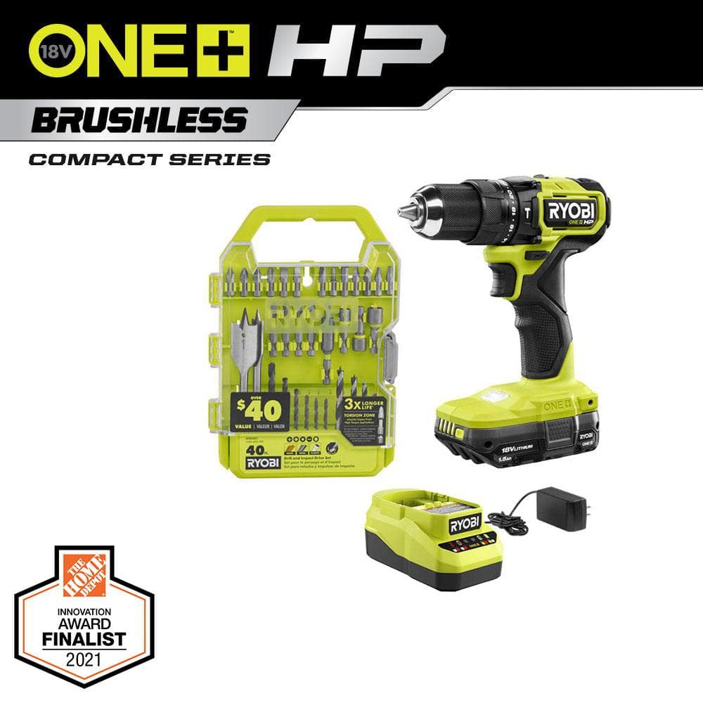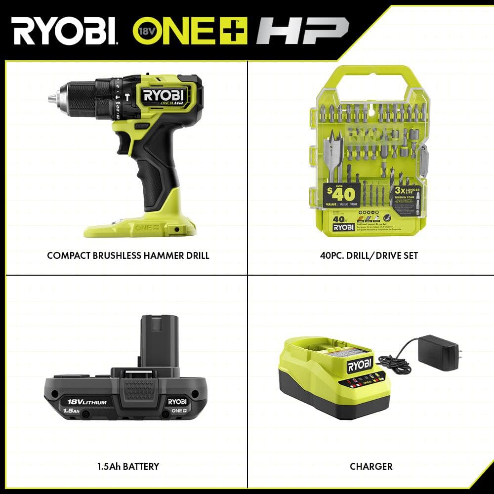 The RYOBI ONE+ HP 18V Brushless Hammer Drill Kit delivers power and precision in a compact design, ideal for professionals and DIY enthusiasts. With its brushless motor, it offers 2X more runtime and impressive torque to tackle concrete, brick, and block effortlessly. Part of the comprehensive RYOBI ONE+ System, this drill kit includes a 1.5 Ah battery and 40 versatile drill bits, all backed by a robust 3-year warranty.