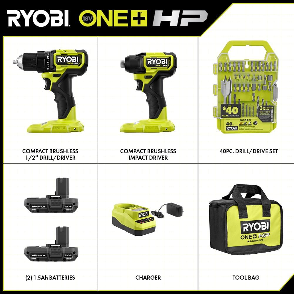 RYOBI ONE+ HP 18V Brushless Cordless Compact 2-Tool Combo Kit w/Drill, Impact Driver, Batteries, Charger, Bag, & 40PC Bit Set