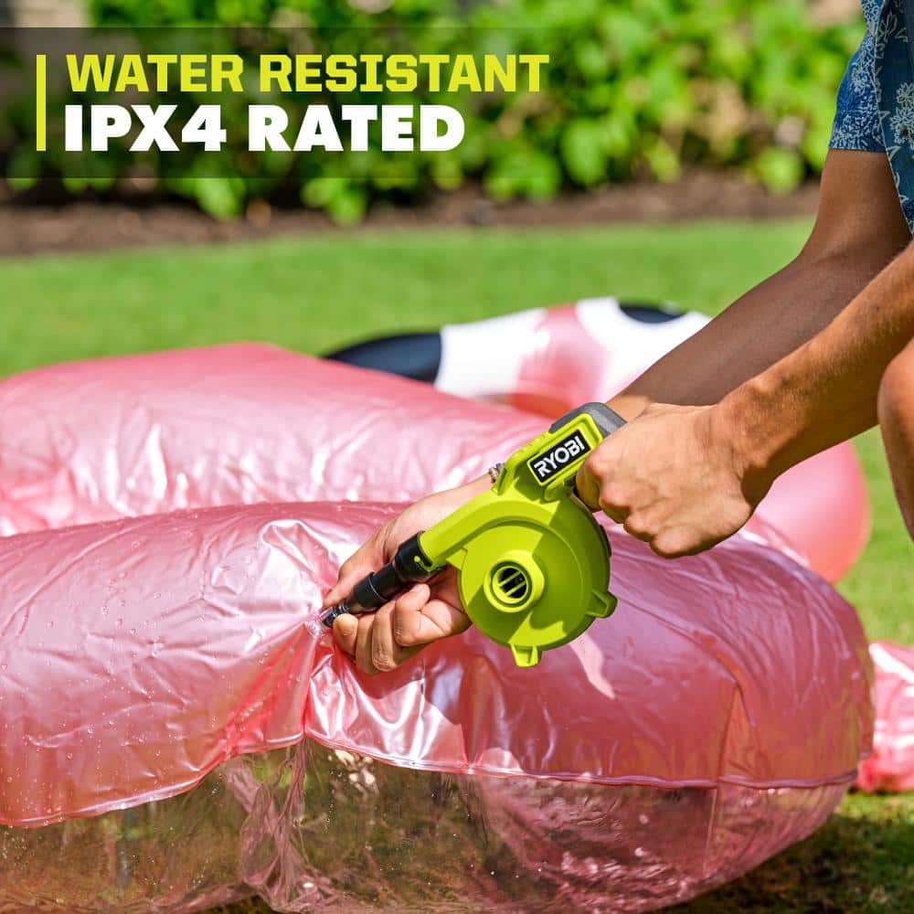 The RYOBI USB Lithium High Volume Inflator Kit is the versatile solution for inflating air mattresses, pool toys, and more with ease. Featuring a compact, water-resistant design and multiple nozzles, it provides quick inflation and compact storage, ideal for travel and small work spaces.
