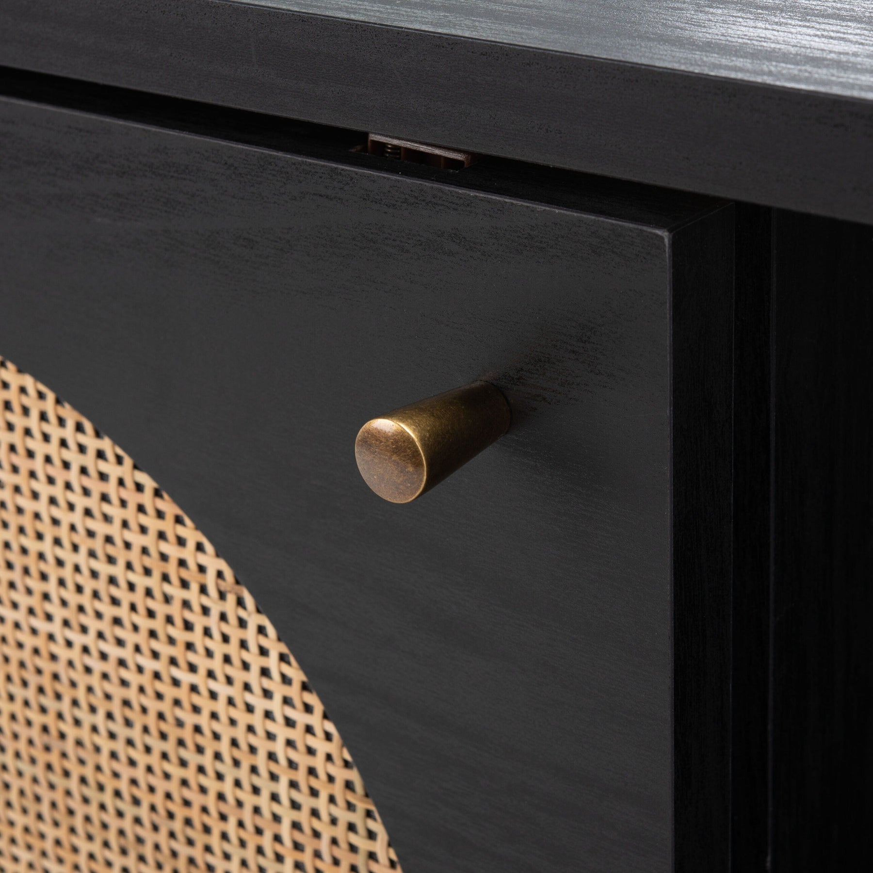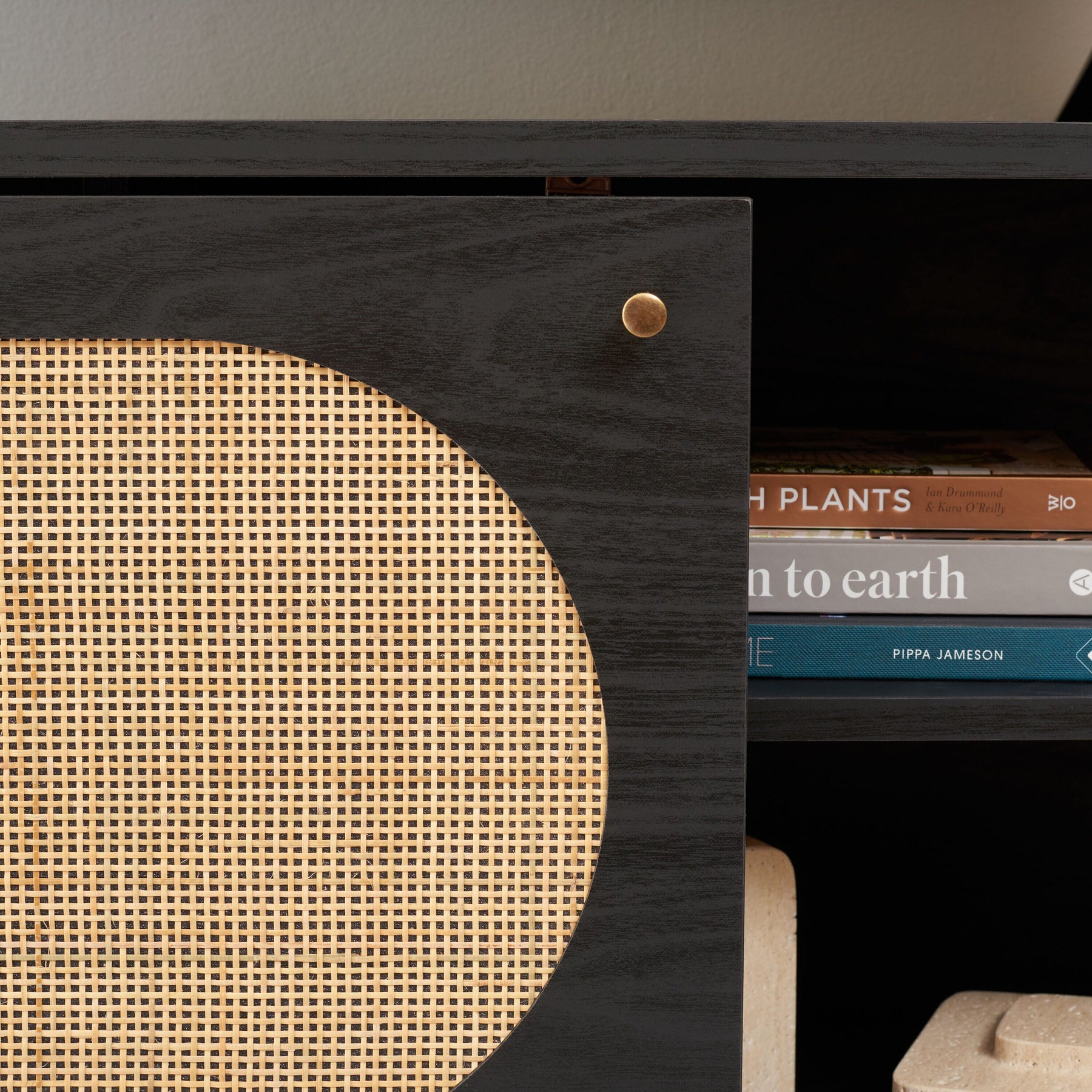 Q: What materials are used in the cabinet's construction? A: The cabinet is crafted with a blend of MDF, rattan, and rubberwood, finished with a sleek black paper laminate.