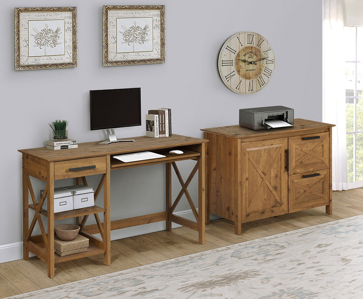 Transform your home office with the rustic allure of the Houstin File Cabinet. Its X-cross accents and rich brown hues echo a countryside elegance, making it not just a storage solution, but a centerpiece. Pair it with a neutral or earth-toned workspace theme to highlight its unique character. This file cabinet establishes a serene, yet sophisticated ambiance, essential for those who value both form and function in luxurious living.