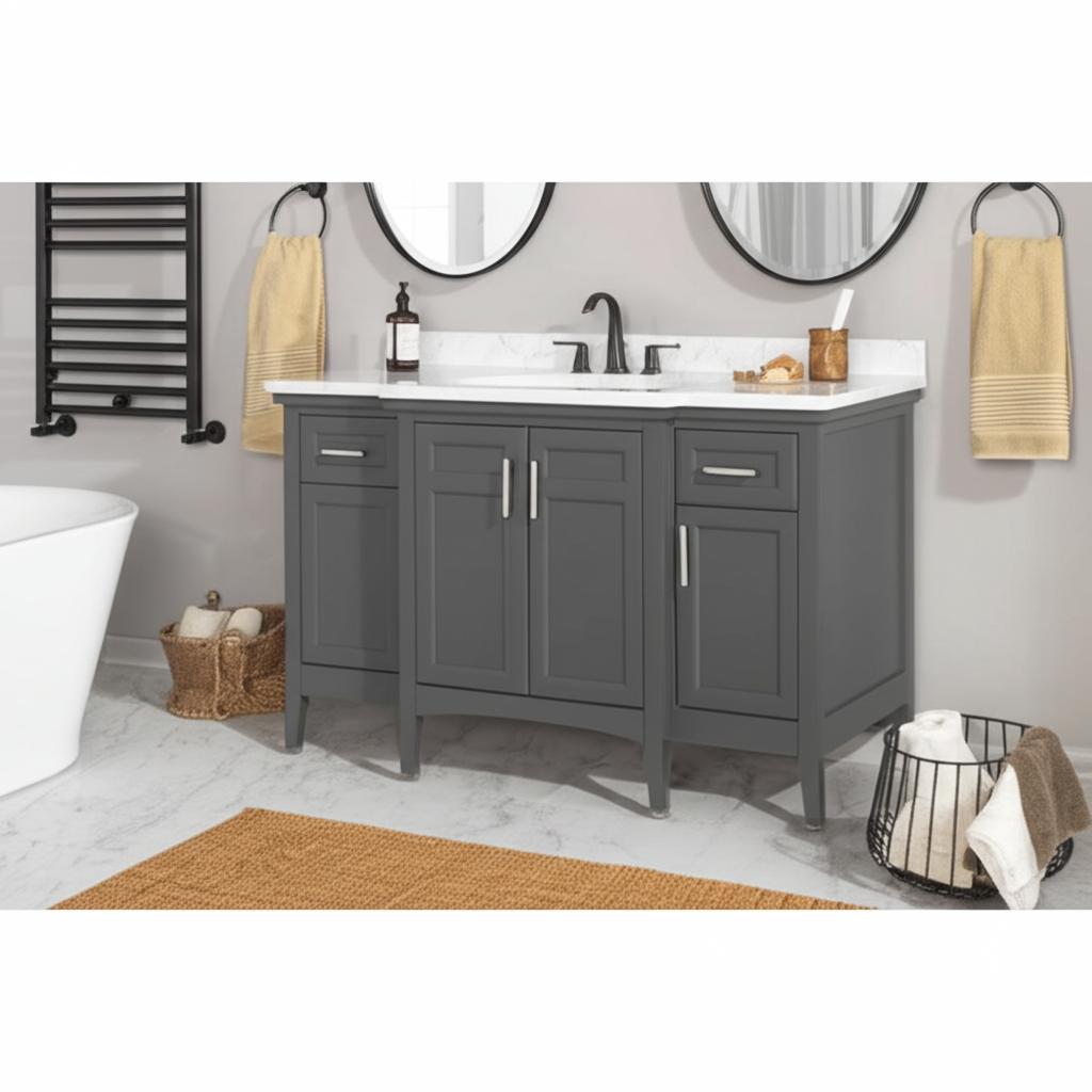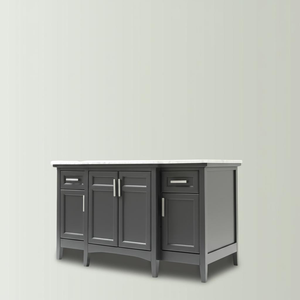 The Sassy 60-Inch Single Sink Vanity combines contemporary design with practical functionality. Featuring a dark charcoal finish, Carrara marble top, and ample storage, this vanity is perfect for modern bathrooms.