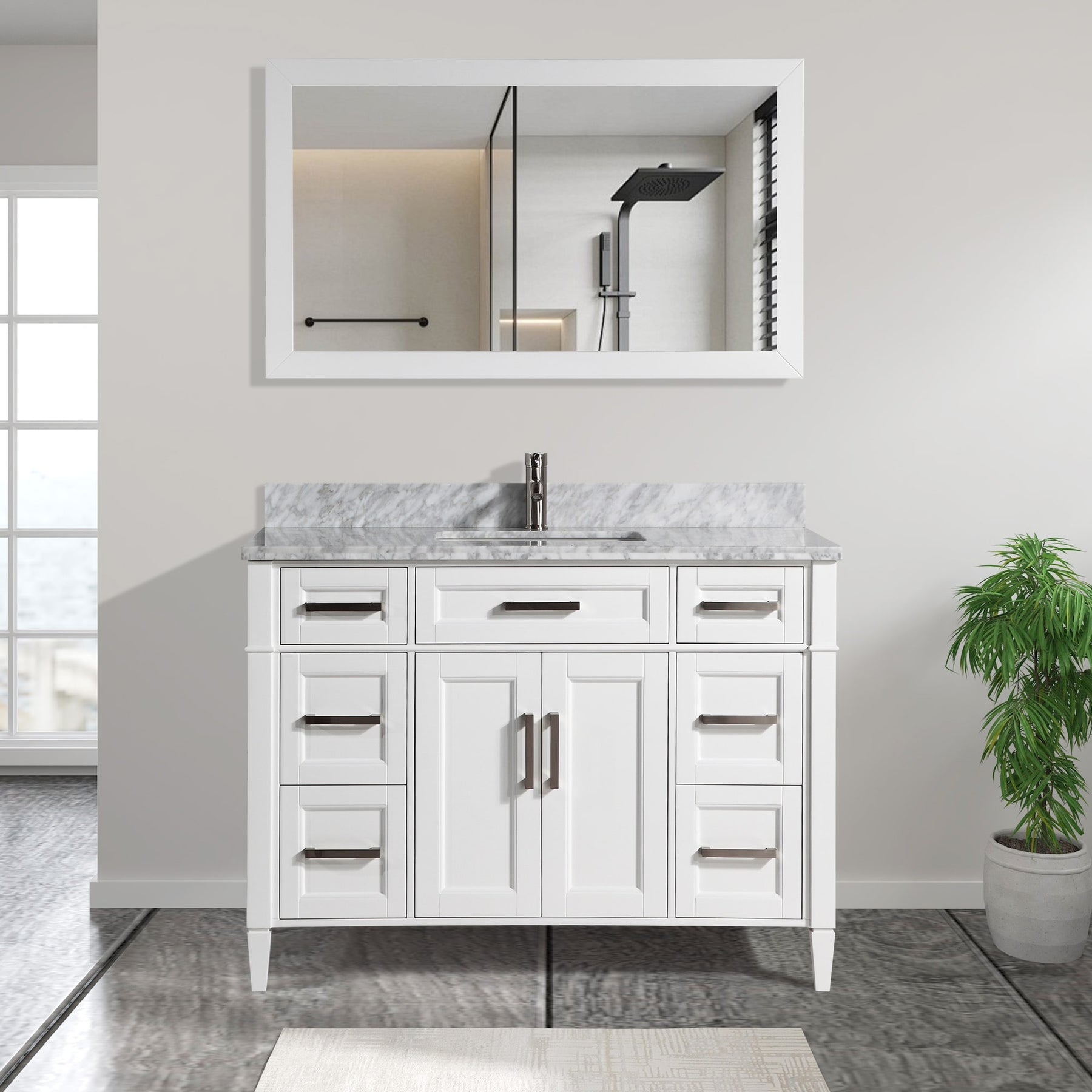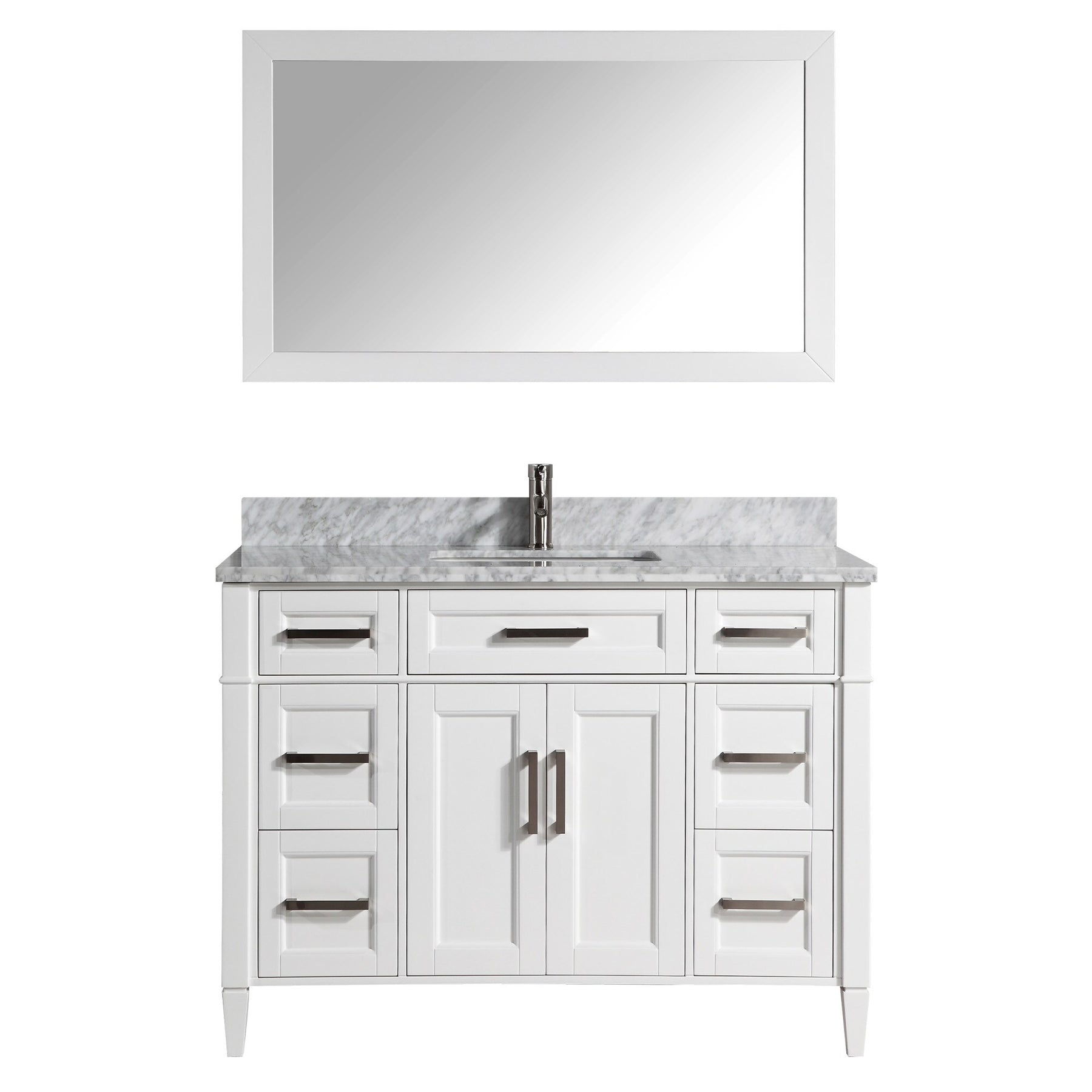 This Savona 48-inch vanity by Vanity Art pairs a moisture-resistant poplar/MDF cabinet in painted white with a durable Carrara marble countertop and matching backsplash. A centered undermount ceramic sink, soft-close doors and drawers, and a framed mirror deliver a complete, modern freestanding solution for stylish bathroom storage.