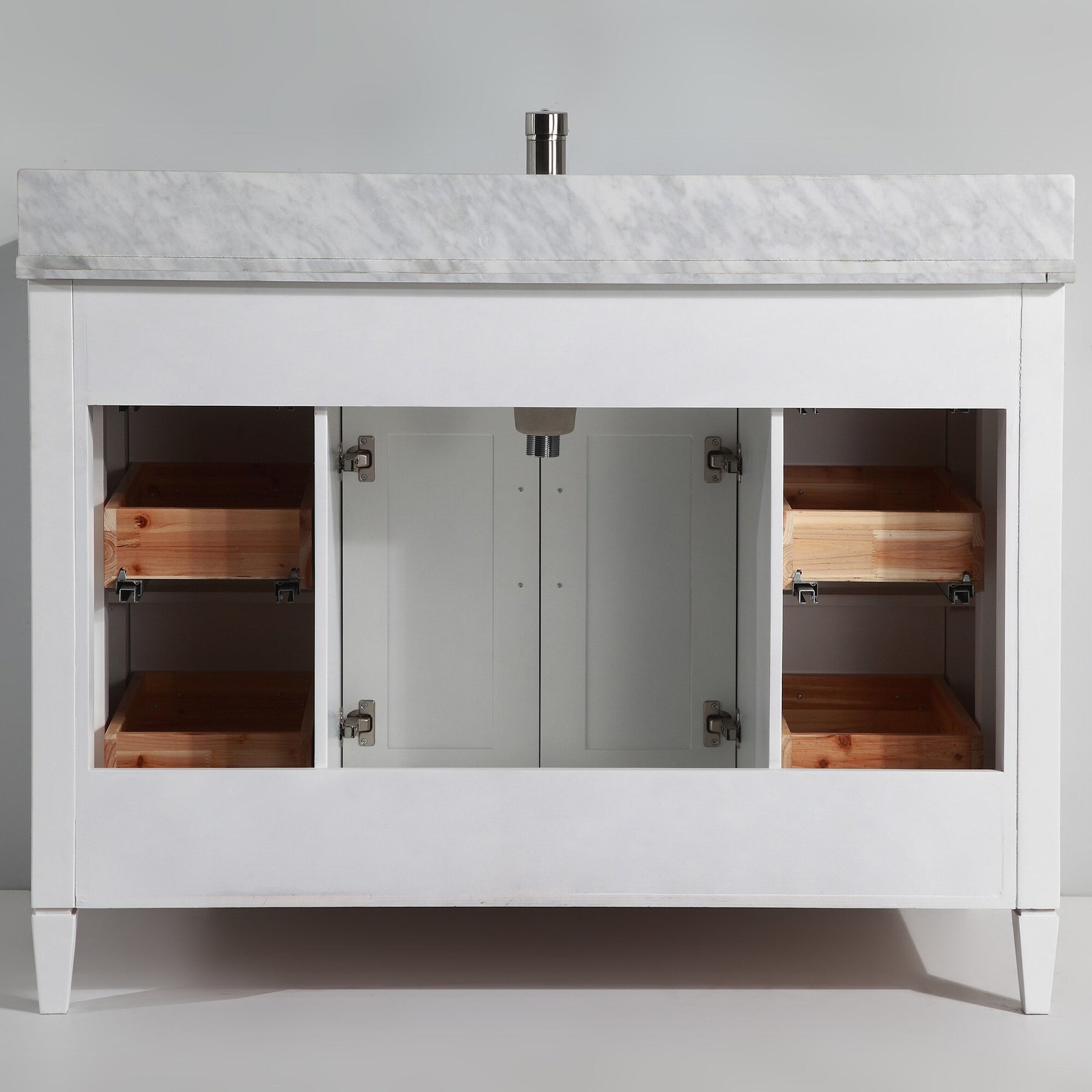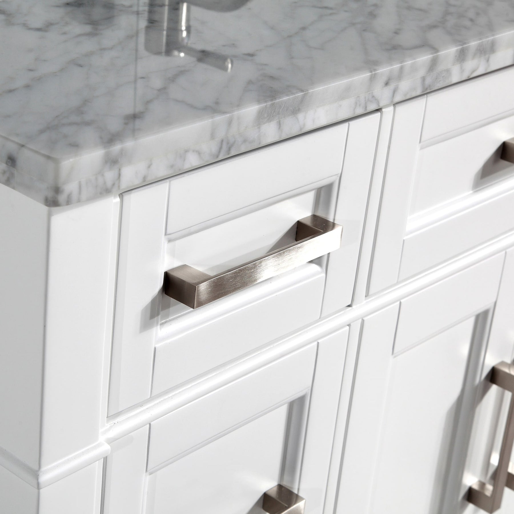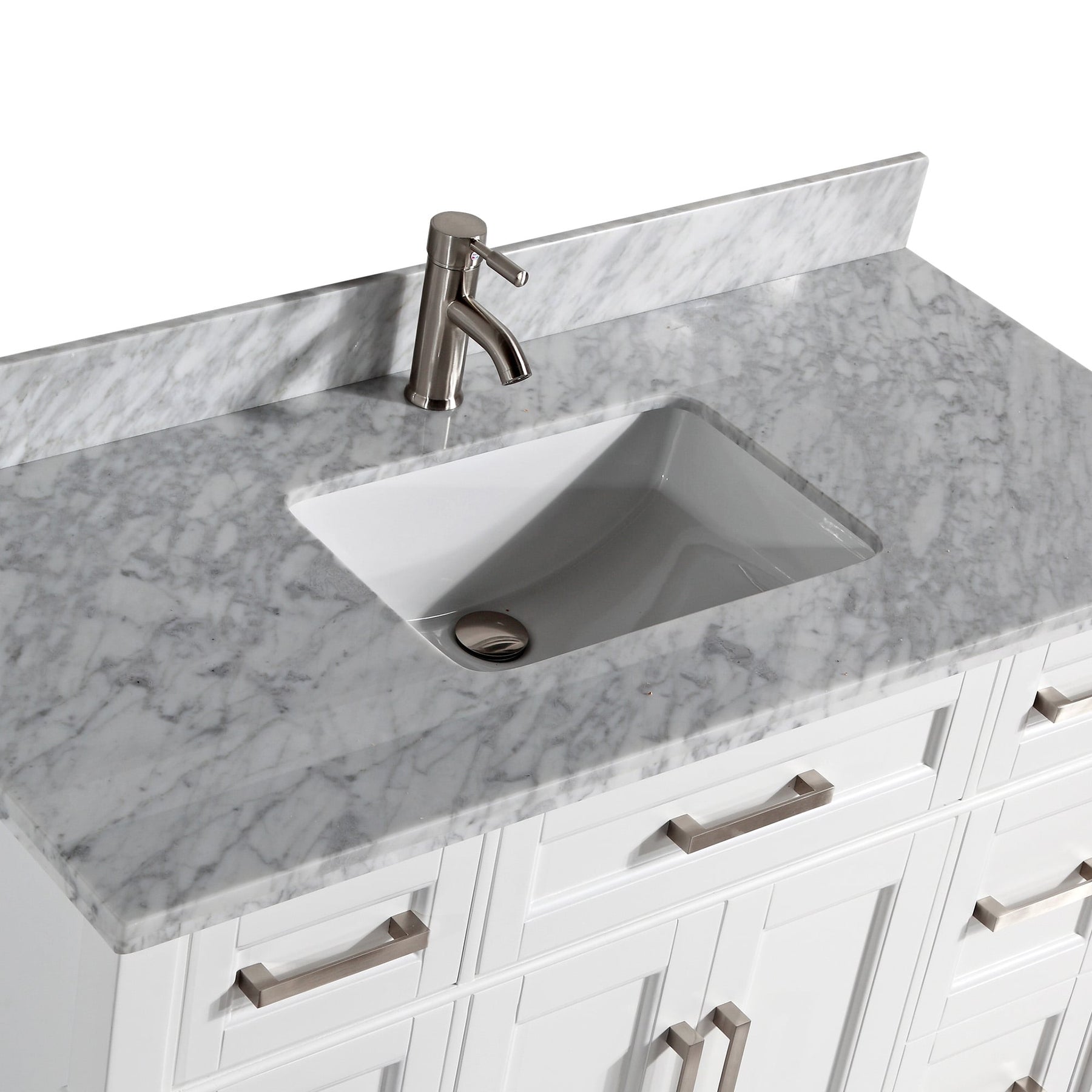 - Carrara Marble Top: 48-inch single-sink slab with 1-in thickness and matching backsplash for timeless durability.