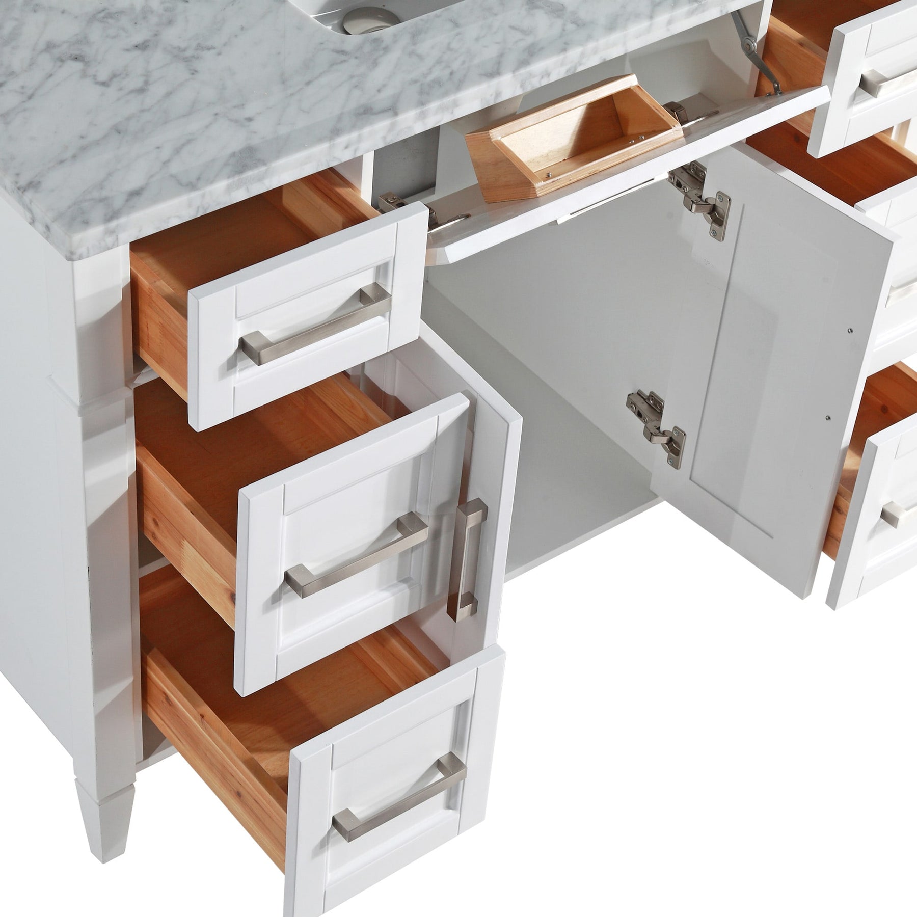 - Soft-Close Storage: 2 doors and 7 dovetailed drawers with brushed nickel hardware minimize noise and wear.
