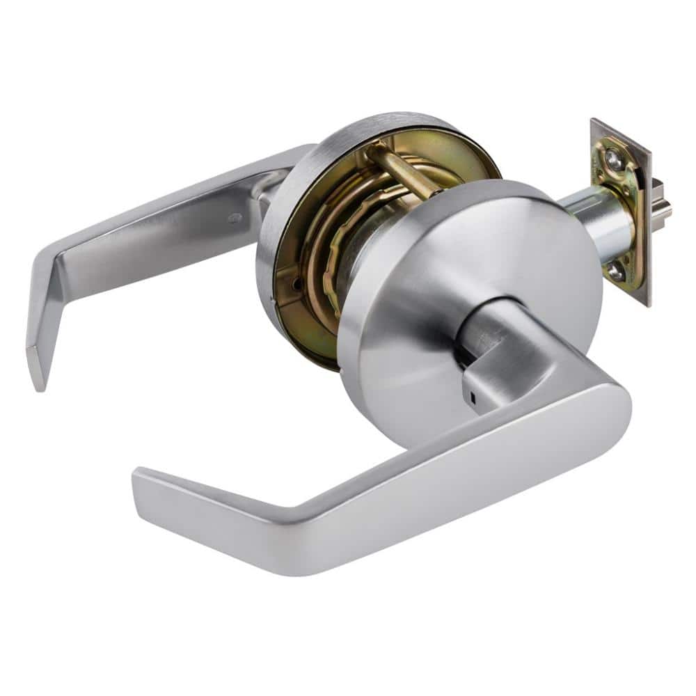 Heavy-duty storeroom lever designed for commercial use, keeping the exterior locked while allowing free egress from inside. Steel construction with a cylindrical chassis delivers reliable performance for high-traffic areas.
