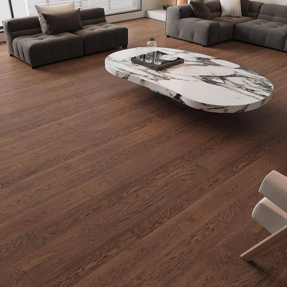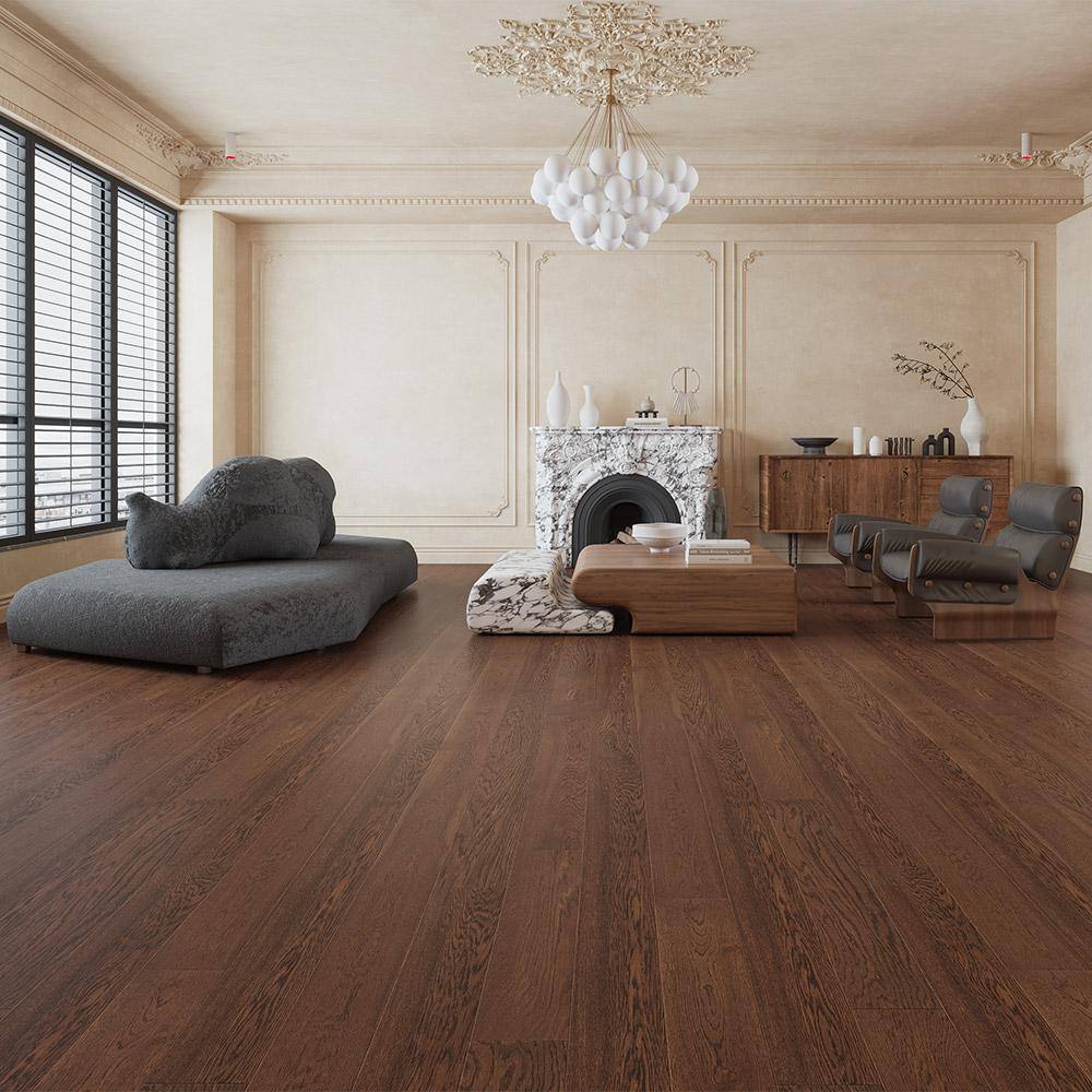 Selkirk's Bixby Creek Brown Oak flooring infuses any room with warm earth tones and an exquisite wire-brushed texture that echoes luxury with a down-to-earth charm. Its deep, rich color effortlessly draws the eye, providing a solid foundation for design creativity. Pair it with creamy textiles and bold, sculptural furniture pieces for a chic contrast that celebrates refined living. In any space, this hardwood stands as a testament to refined taste and an appreciation for natural beauty.
