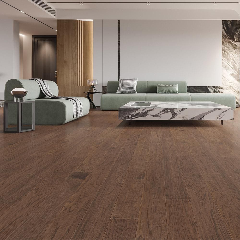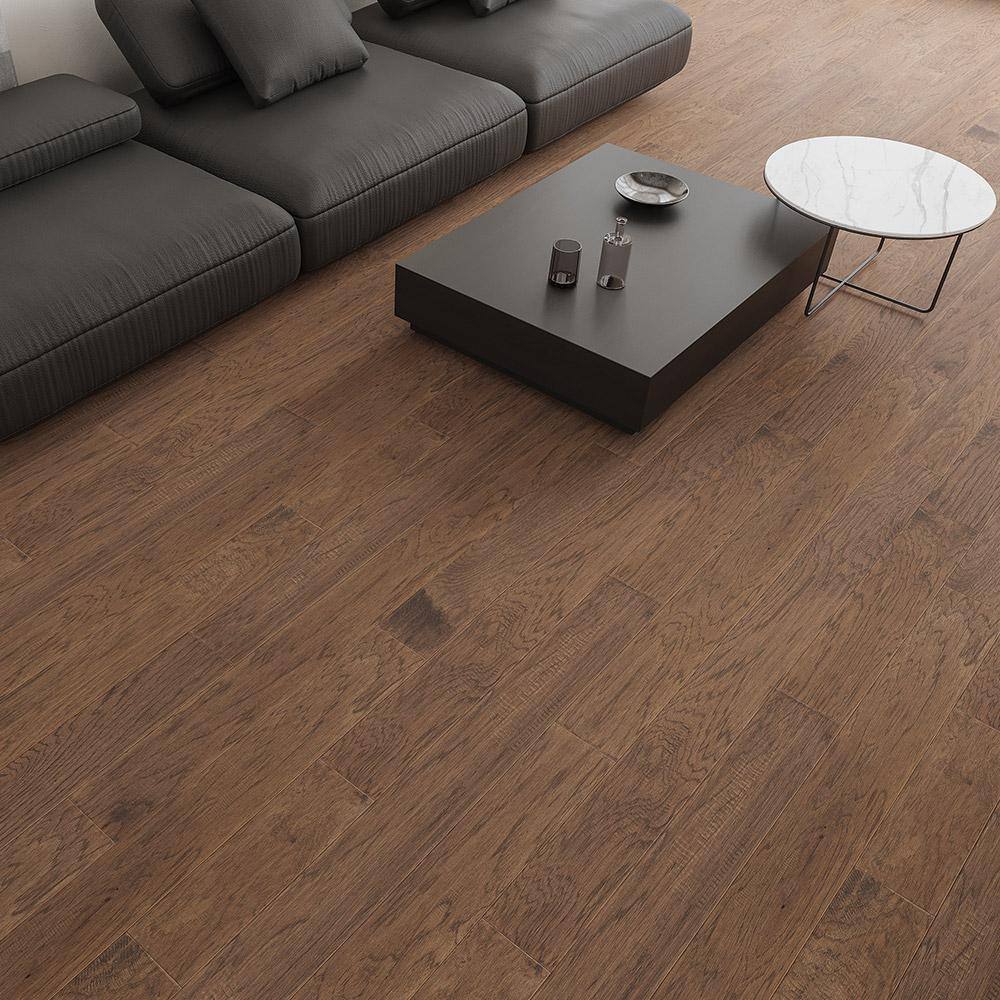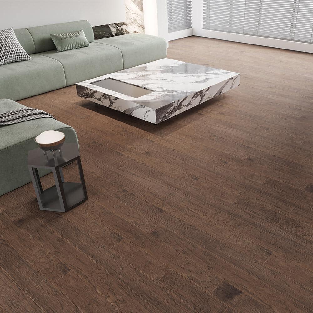 Transform your space with the Captival Hickory Engineered Hardwood Flooring, a celebration of rustic elegance through its hand-scraped texture. The warm, earthy tones and variable plank lengths infuse any room with natural charm and sophistication. Picture this flooring as the foundation of a cozy reading nook or an expansive open-plan living area, effortlessly connecting indoor spaces in harmony with nature. It's an essential piece for those who appreciate sustainable luxury in their surroundings.