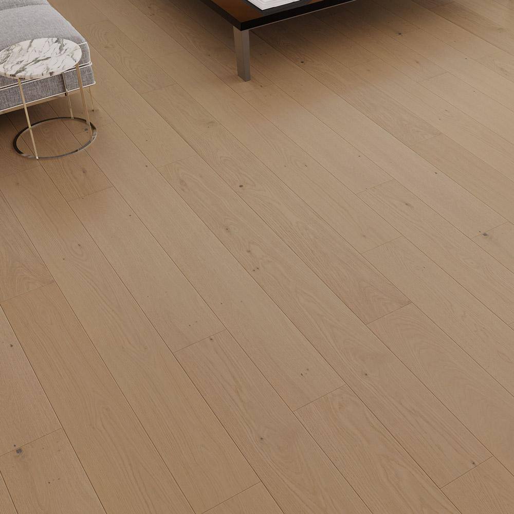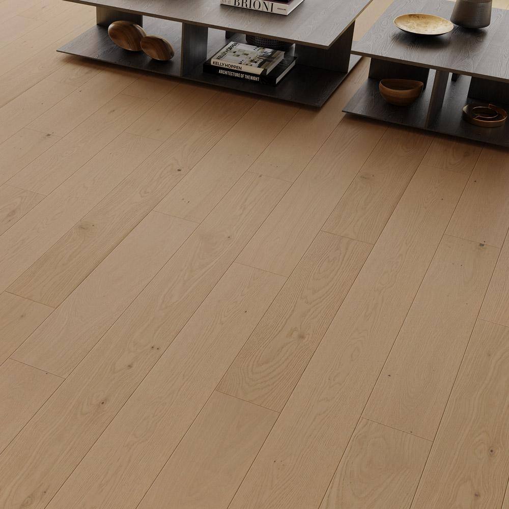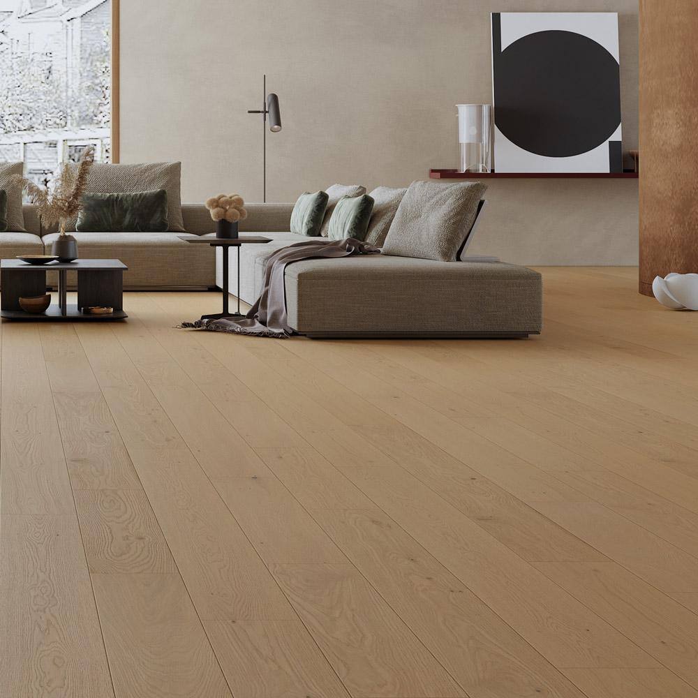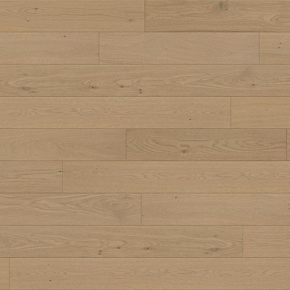 Selkirk's Grand Buckland flooring transforms any room into a gallery of elegance and warmth, each plank a canvas of delicate wire-brushed textures and rich oak tones. Its expansive width evokes a sense of grandeur, while the subtle sheen of the aluminum oxide finish catches the light beautifully. Pair this flooring with plush area rugs or minimalist furniture to highlight its natural beauty. It's a testament to refined living, harmonizing modernity with timeless sophistication.