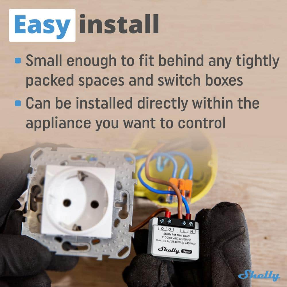 Q: How is the Shelly PM Mini Gen 3 installed? A: Installation is straightforward; simply connect the device behind existing switches or sockets. Consult the user manual for step-by-step guidance.