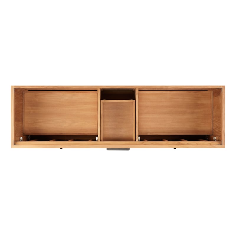 The Aliso vanity infuses the bath with airy warmth—its sleek teak lines and elevated legs feel tailored yet effortless. A thick marble top frames the crisp, rectangular basins, while matte black pulls punctuate the façade like jewelry. Style it with a minimalist wall sconce and soft linen textures to let the wood’s natural grain glow. It’s a refined essential that makes everyday rituals feel luxuriously curated.