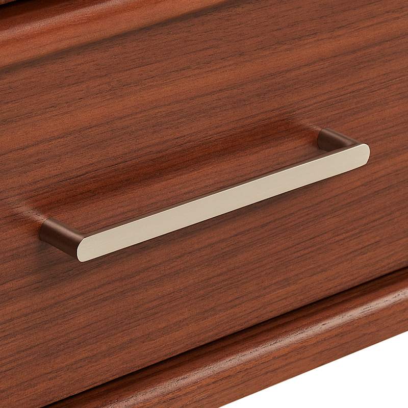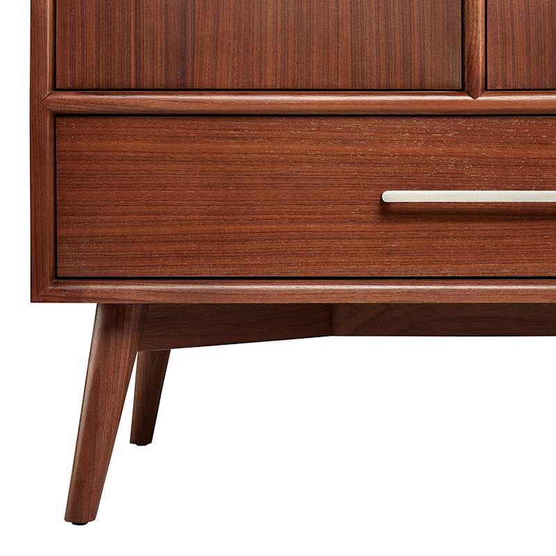 A mid-century modern statement, the 60" Novak double vanity pairs a solid mahogany cabinet in a True Walnut finish with a stone top and twin rectangular porcelain sinks. Thoughtful storage includes four doors and five soft-close drawers, while the included backsplash and widespread faucet drillings simplify installation.