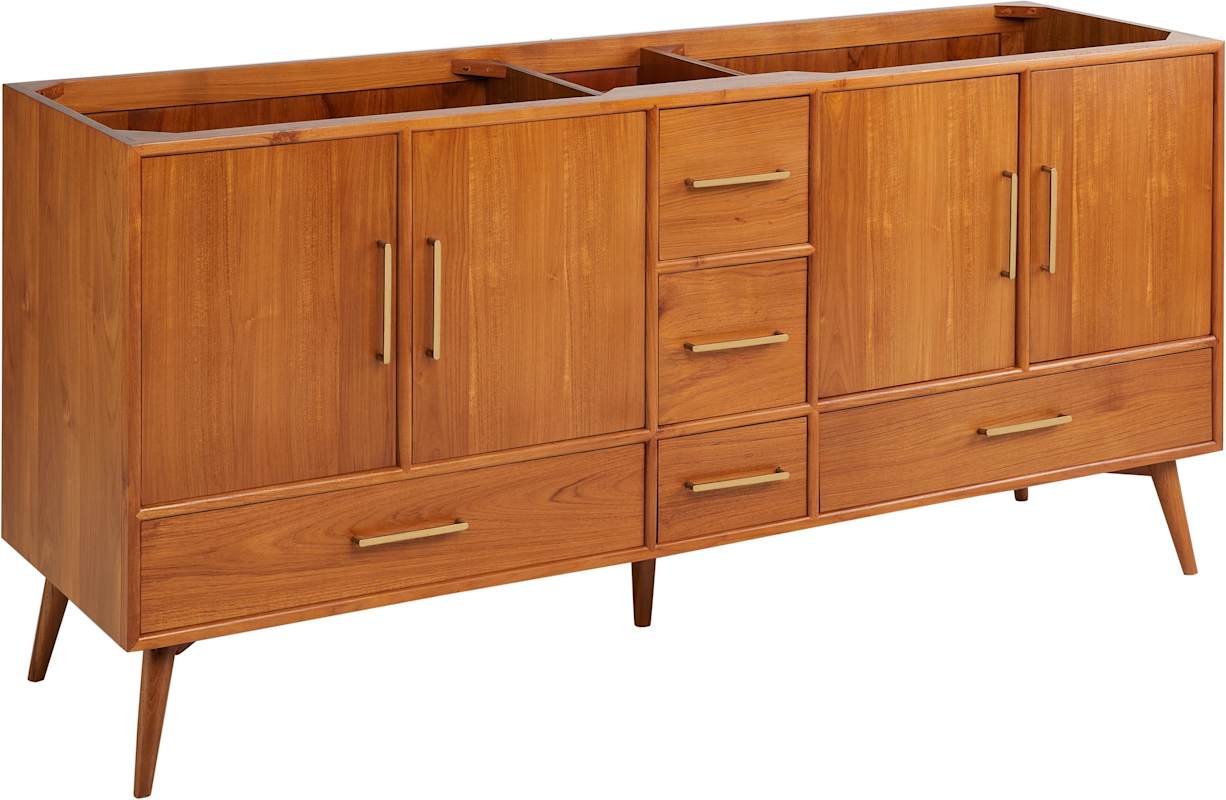 Novak’s warm teak and svelte brass hardware bring a refined, mid‑century cadence to the bath, transforming daily routines into a ritual. The elongated 73-inch stone top and twin rectangular sinks balance elegance with function, while tapered legs lift the silhouette with airy sophistication. Style with matte black faucets for crisp contrast and a vintage rug to ground the palette. This vanity is the definitive statement for modern, luxurious living.