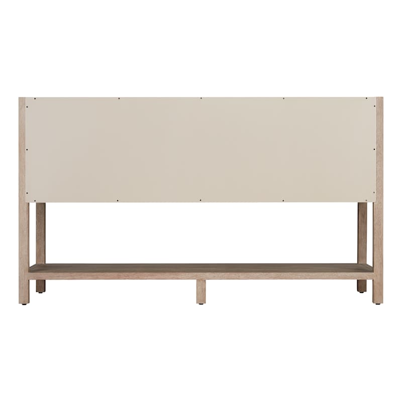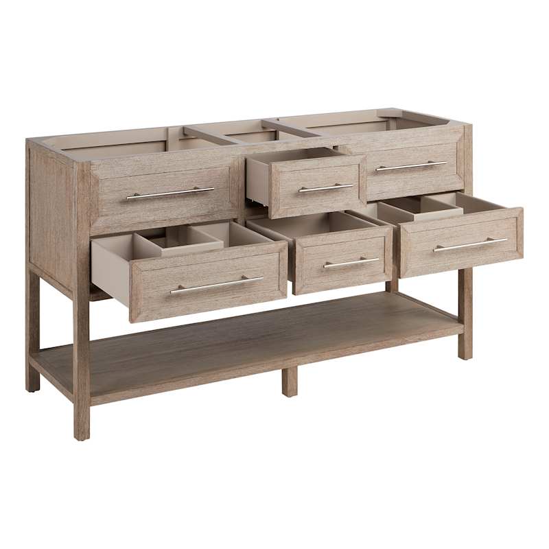 A console-style 60" double vanity that blends solid mahogany craftsmanship with a durable quartz top and rectangular undermount sinks. Four soft-close drawers and an open lower shelf offer flexible storage, while corrosion-resistant hardware and an included backsplash complete the polished look.