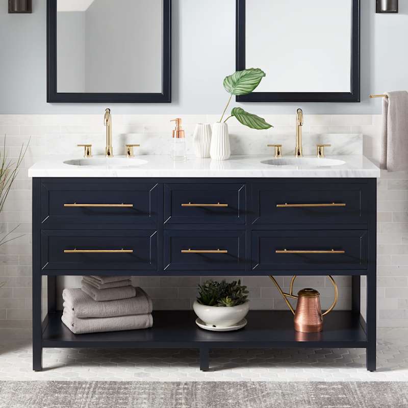 A solid mahogany, free-standing double vanity designed for lasting beauty and storage. Four soft-close drawers and a full-width lower shelf keep essentials organized, while satin brass pulls complement the midnight navy blue finish.