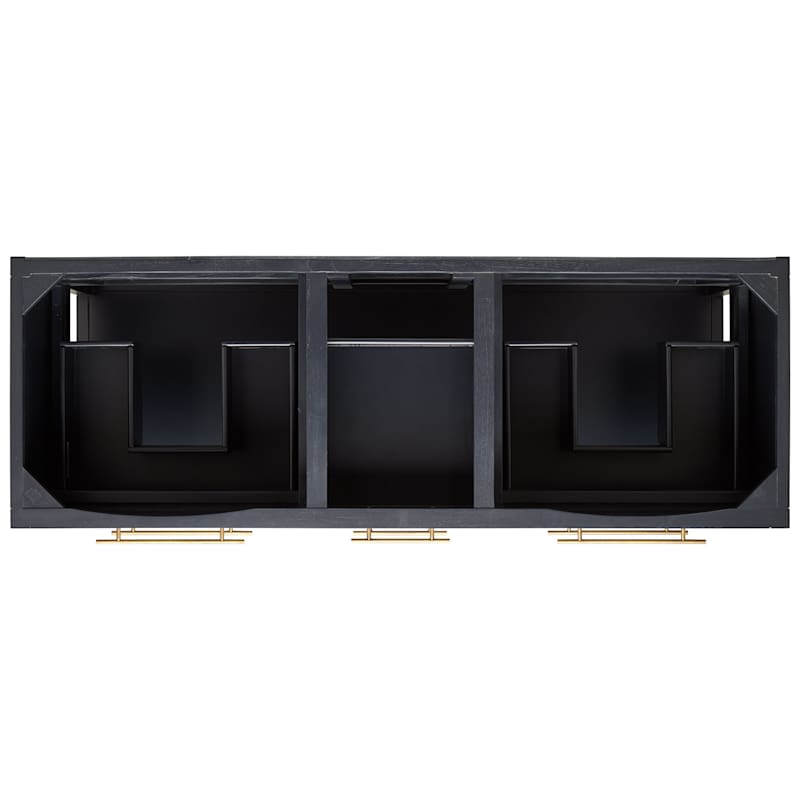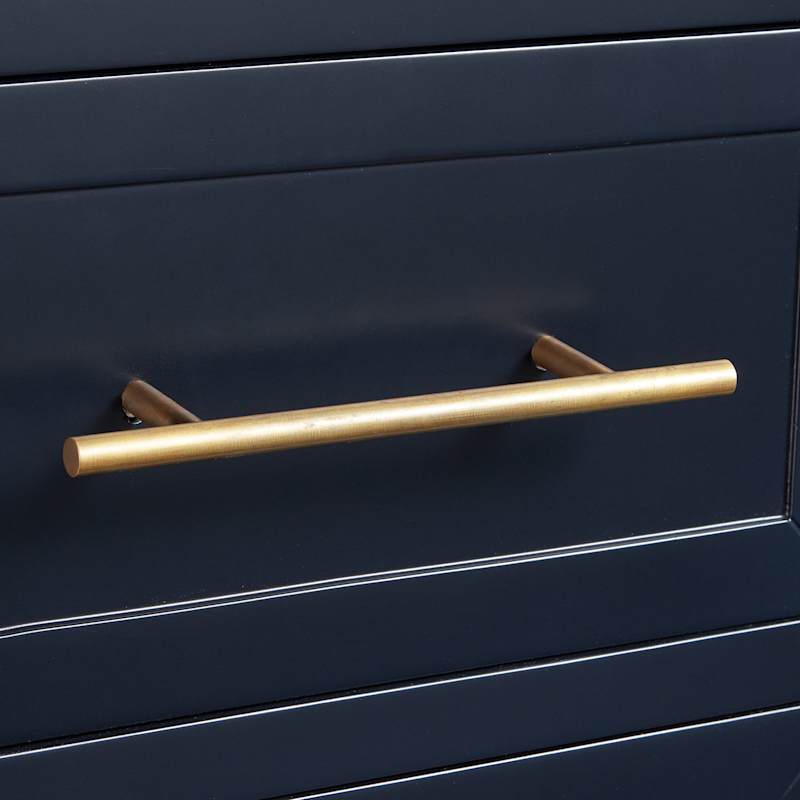 Across multiple retail sites, buyers consistently praise the cabinet’s build quality, rich midnight navy finish, and elegant satin brass hardware. Storage layout with soft-close drawers and the open shelf is highlighted as practical and roomy. Some notes mention the unit is heavy, especially with the stone top, and require careful placement; a few buyers replaced the included pulls to match other metals. Overall sentiment is very positive, emphasizing premium materials and design. Representative quotes: “Solid and beautiful—drawers glide perfectly,” “Color is a deep navy that looks luxe,” and “Heavy piece; make sure you have help for install.”