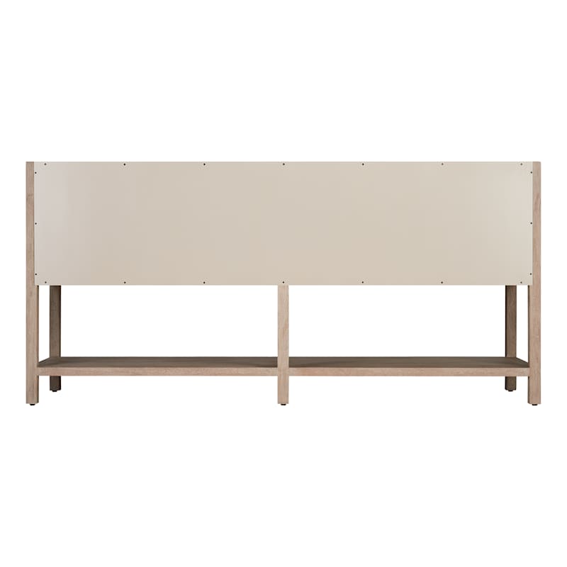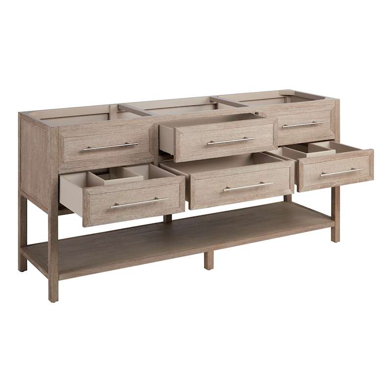 A statement 72-inch double vanity crafted from solid mahogany with a durable quartz top and rectangular undermount sinks. Features four soft-close dovetail drawers and an open lower shelf for everyday essentials. Designed for free-standing installation with 8" widespread faucet drillings and a matching backsplash.
