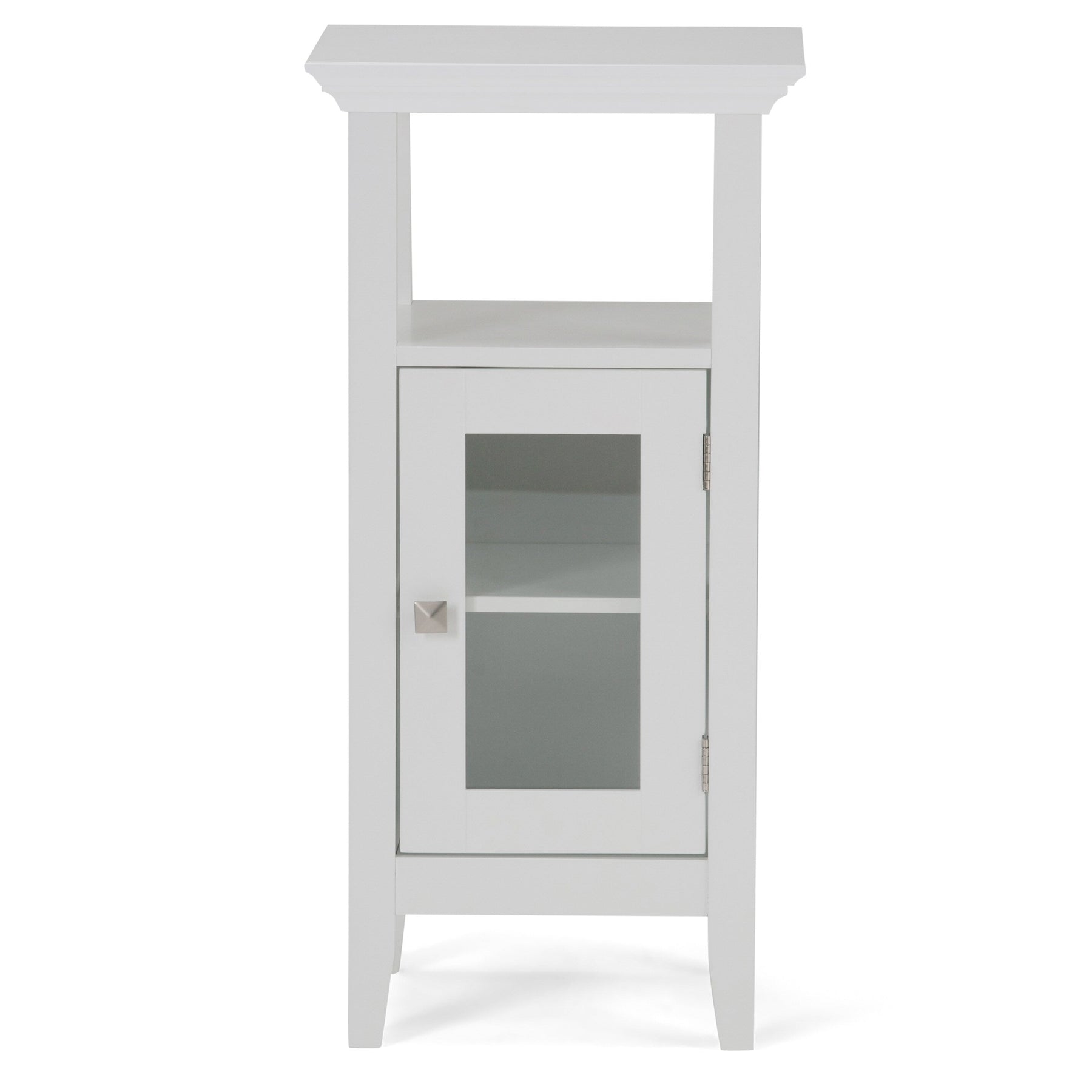 Elevate your bathroom to new heights of sophistication with the Simpli Home Acadian Linen Cabinet. Its pure white finish and grooved side details establish a sense of airy elegance in any space. Ideal for showcasing plush towels behind its tempered glass door, this cabinet infuses a touch of contemporary flair while optimizing your storage. Transform your everyday bath experience into one of luxury and careful curation, essential for a well-considered home.