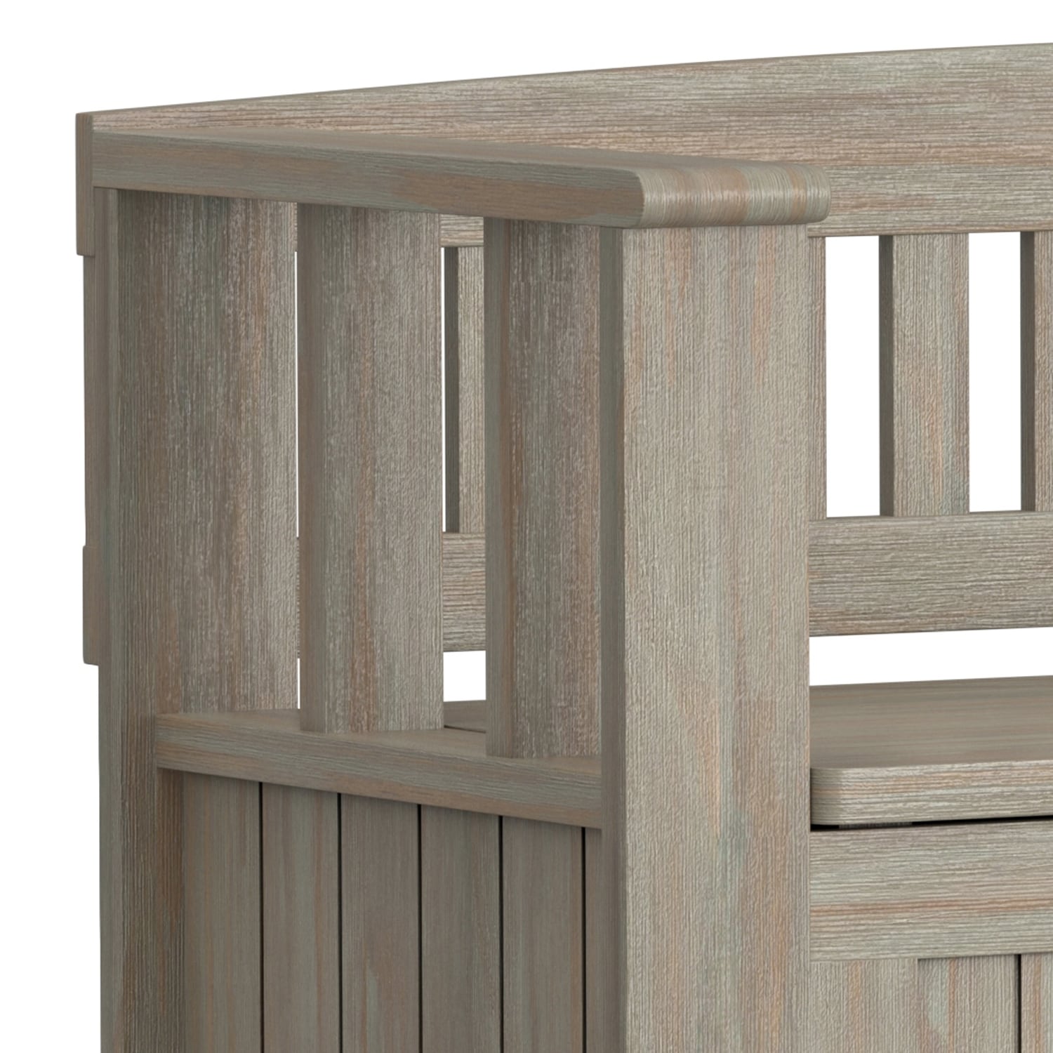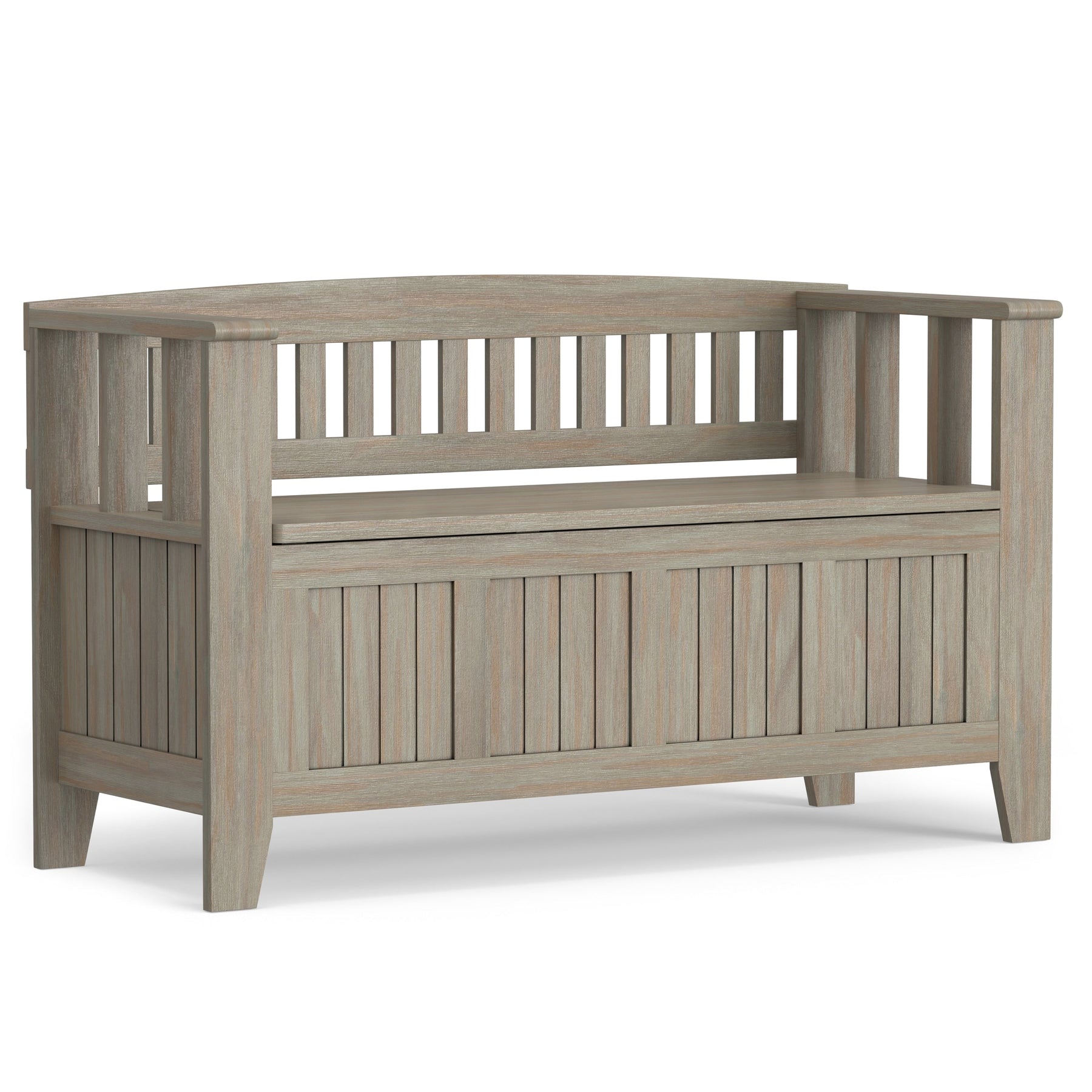 Transform your entryway with the Simpli Home Acadian Distressed Grey Storage Bench. Crafted from solid wood, it offers dual functionality as both a seating solution and a spacious storage unit. The distinctive distressed grey finish and transitional design seamlessly blend style with practicality, making it an ideal addition to any home.