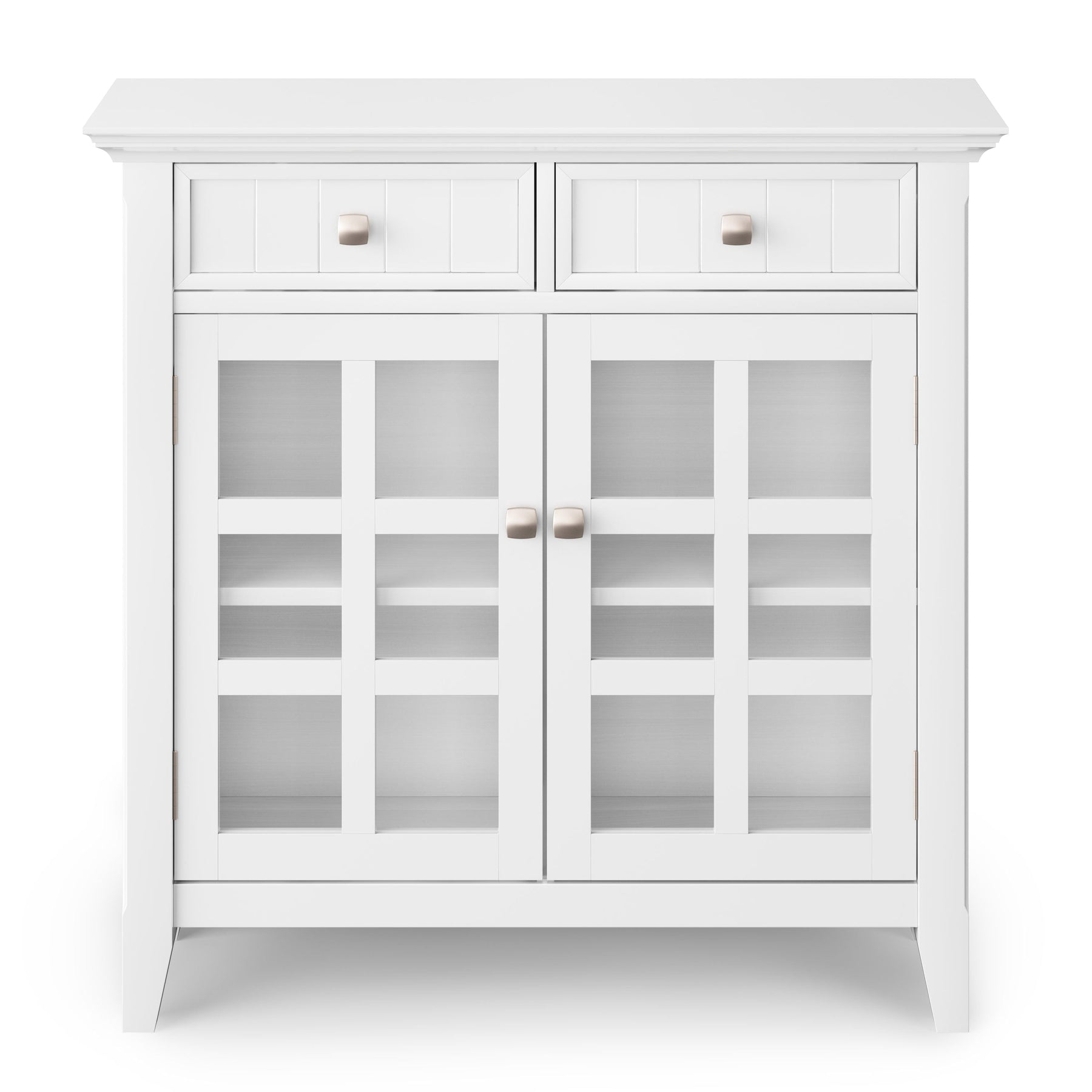The Simpli Home Acadian White Wood Media Cabinet offers both elegance and practicality for your living space. Crafted from the finest solid pine wood, this transitional-style cabinet provides ample storage with its two drawers and adjustable-shelved interior. Its white finish and brushed nickel knobs add a fresh, clean look perfect for any room.