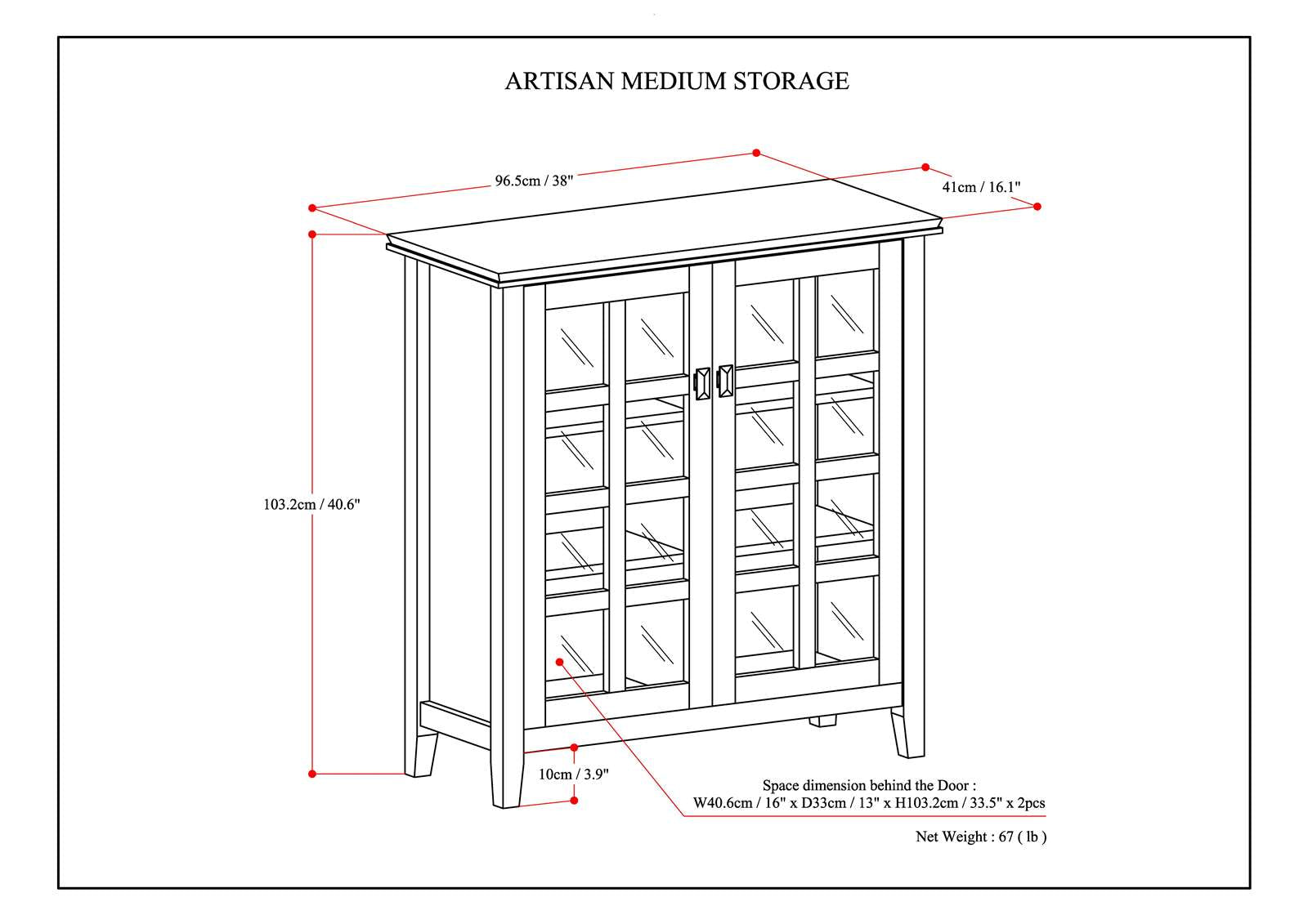 Versatile Storage: Includes two tempered glass doors leading to four adjustable shelves, accommodating various storage needs.