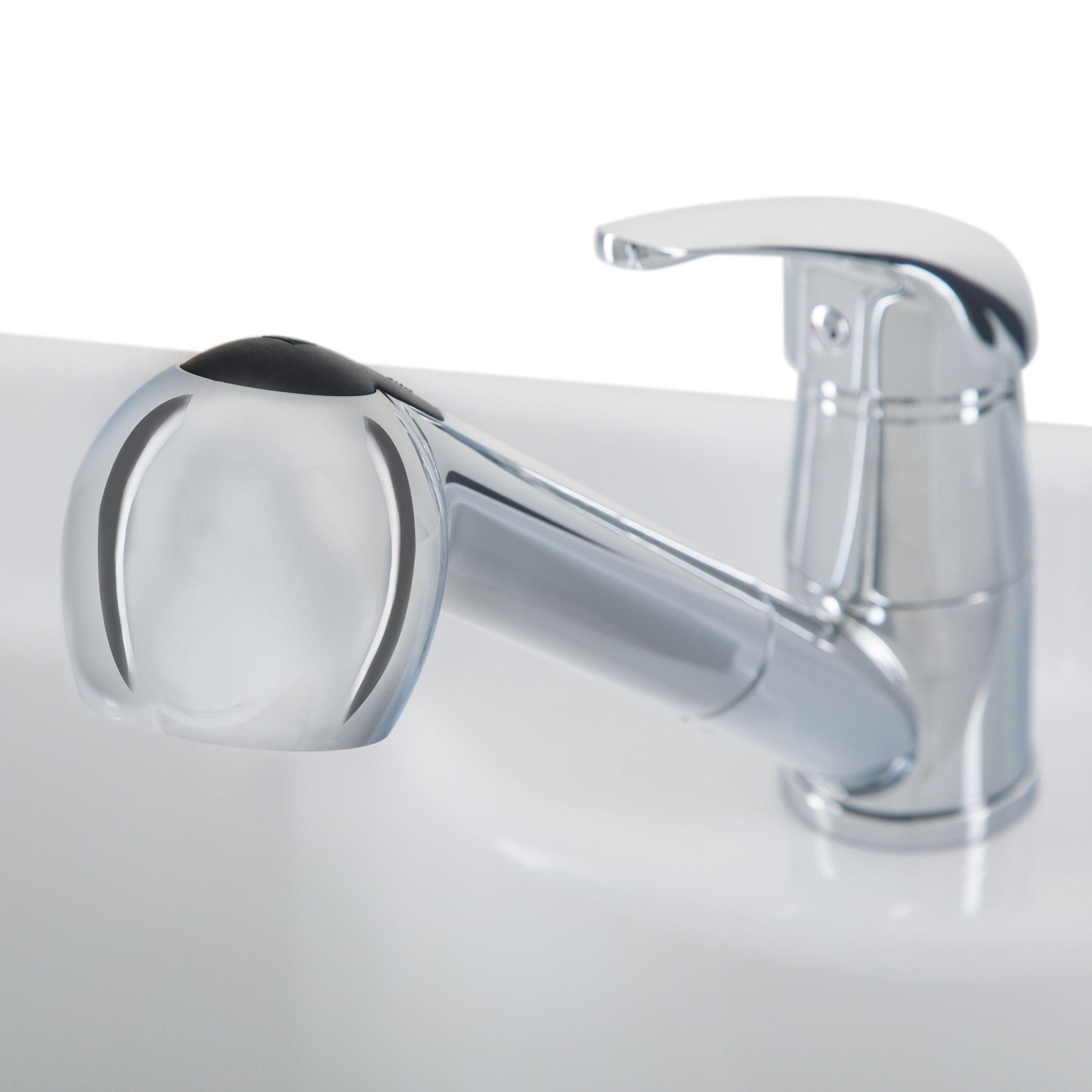 Integrated Faucet: Equipped with a single lever faucet including an on and off spray mechanism.