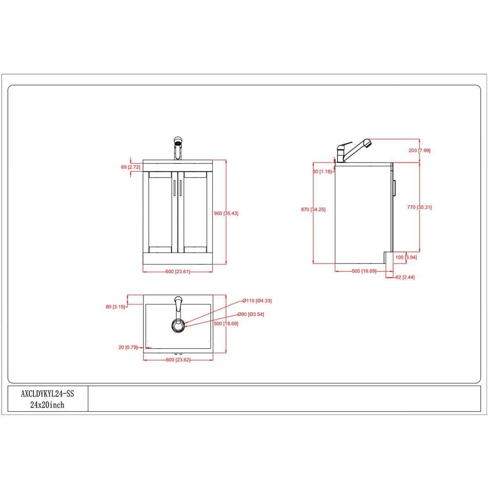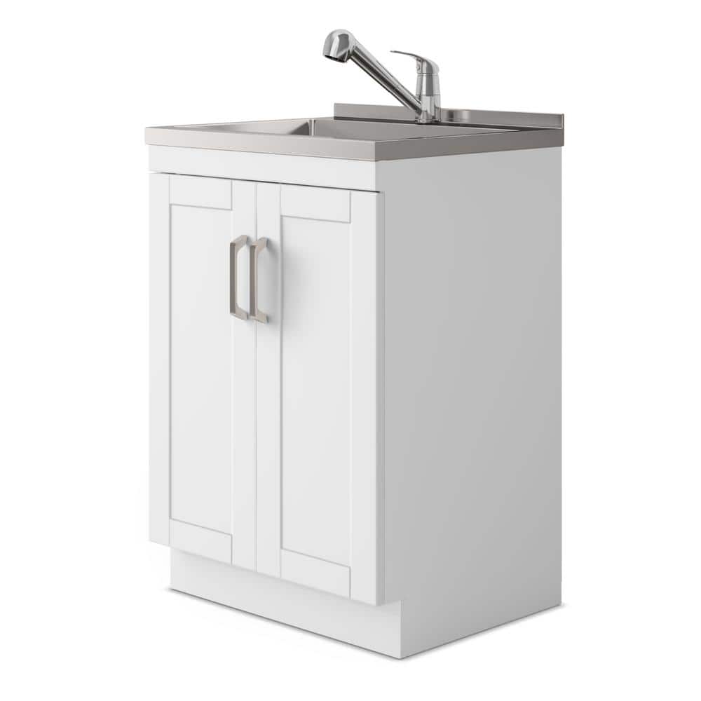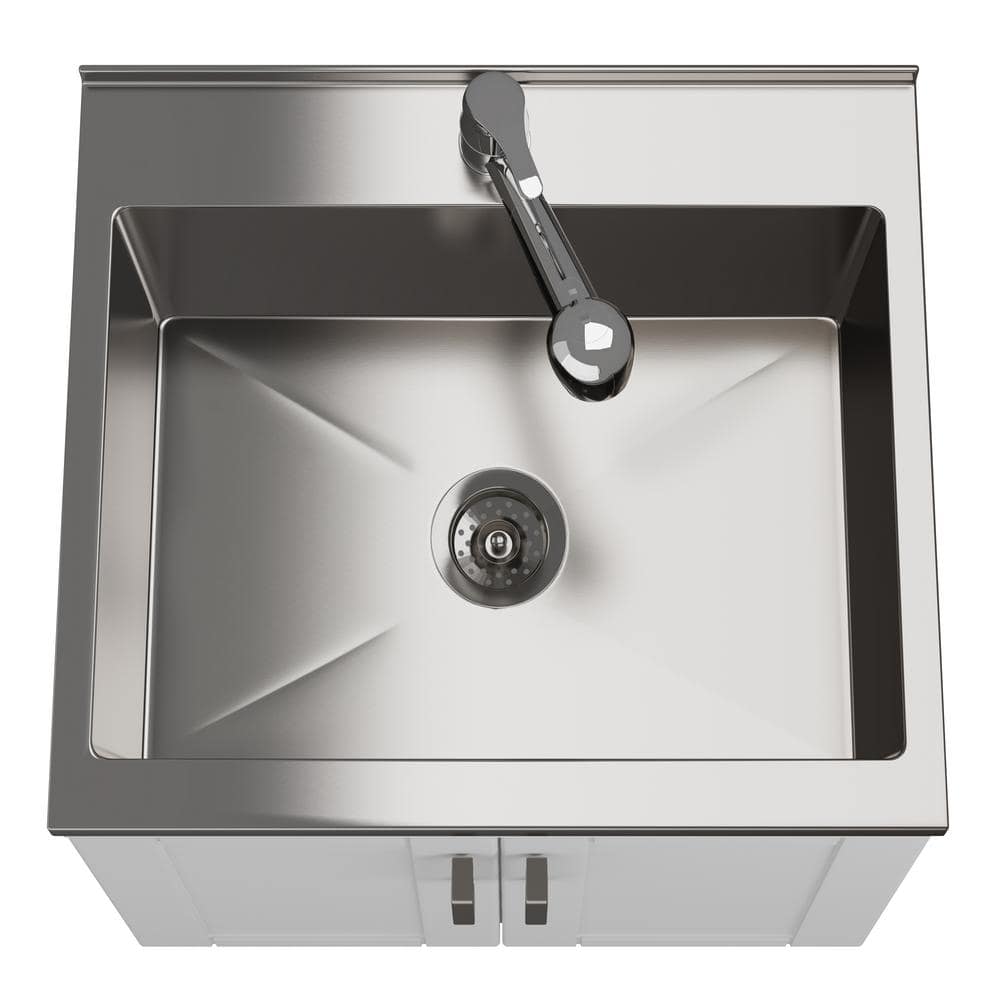 Q: What materials are used in the construction of this laundry sink? A: The cabinet is constructed using MDF and PVC, while the sink is made of 20 gauge stainless steel.