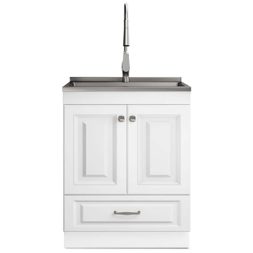 Upgrade your laundry room with the Simpli Home Lawrence All-in-One 28-inch Utility Sink and Cabinet. This sophisticated yet functional unit features a deep stainless steel sink with a high-arch faucet and ample storage in a sleek white cabinet. Ideal for compact spaces, it combines elegance and efficiency, making laundry tasks a breeze.
