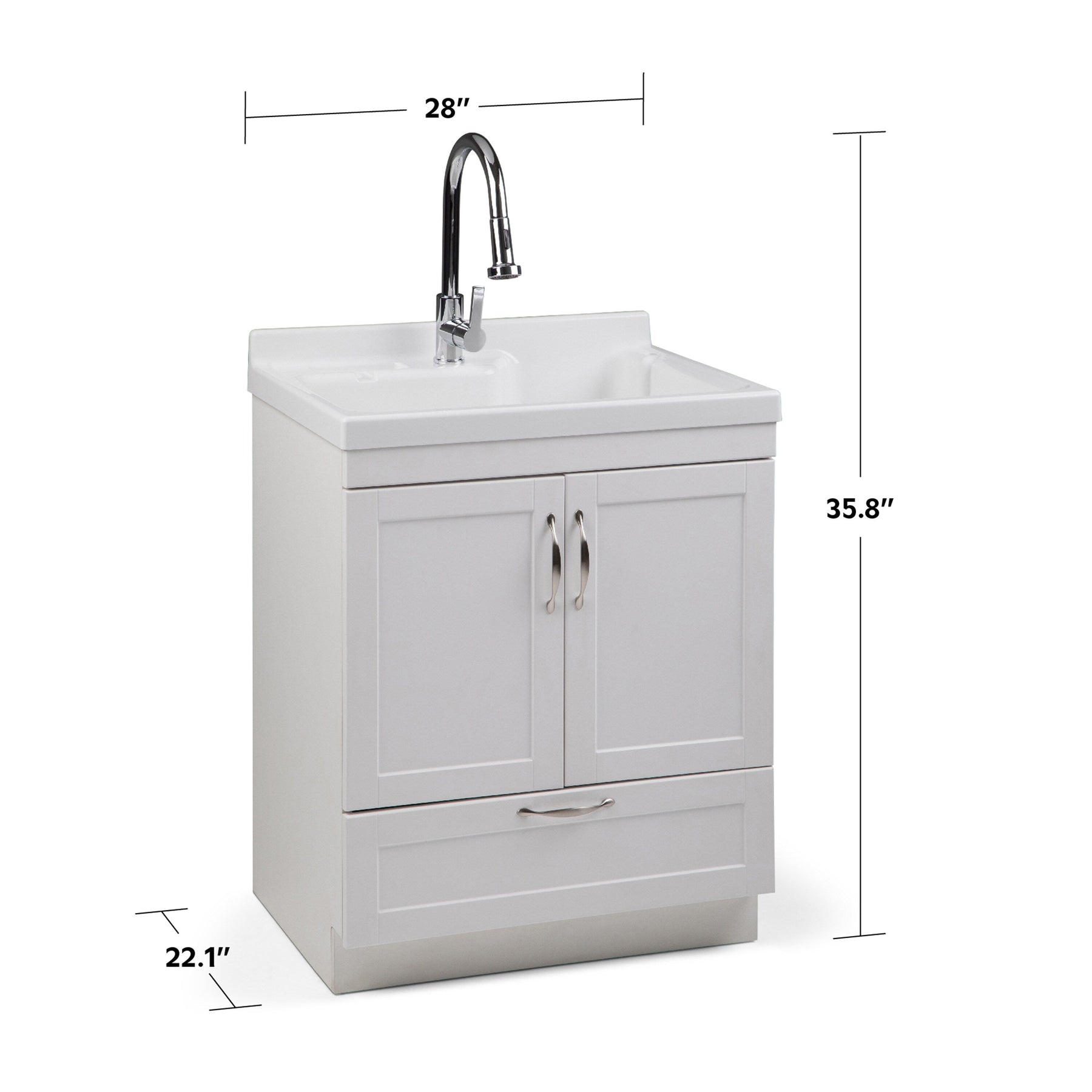 Elevate your laundry space with the Simpli Home Maile Freestanding Laundry Sink. This 28-inch Pure White unit features a durable, extra-deep ABS sink and a high-arch single lever faucet. The two-door plus one-drawer cabinet offers ample and stylish storage for all your laundry essentials.