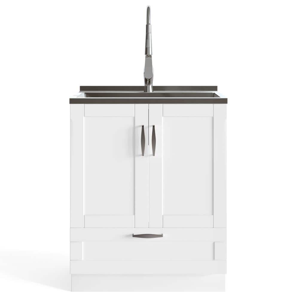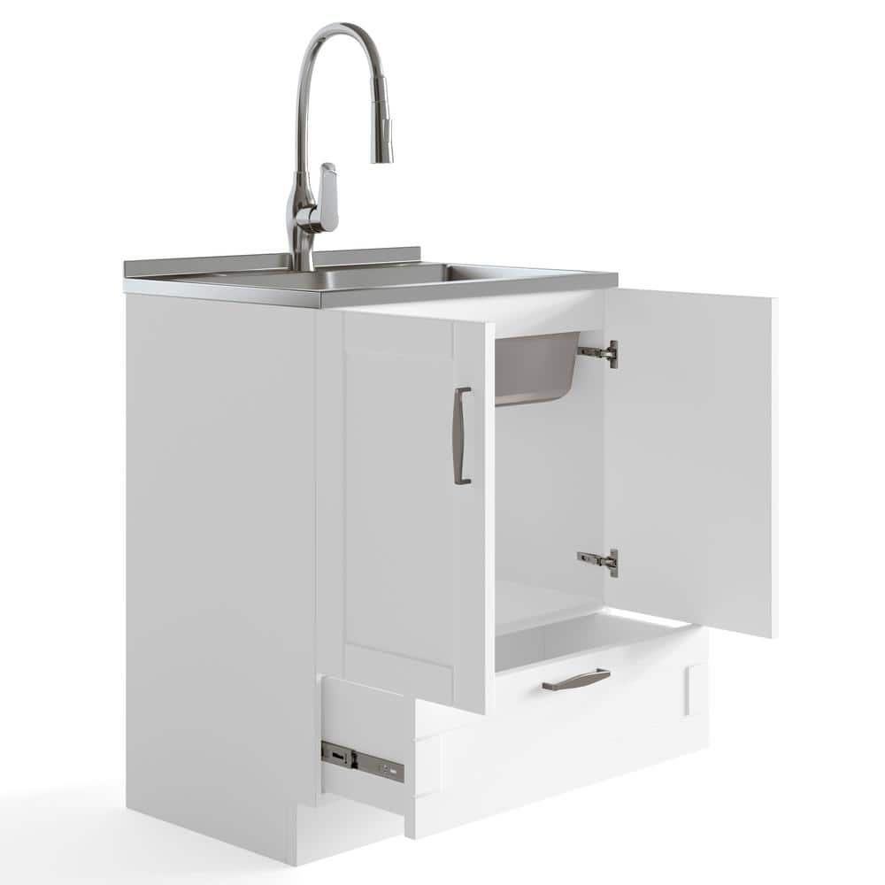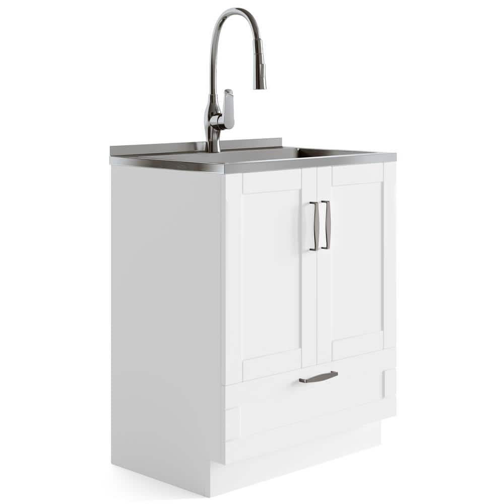 The Simpli Home Reed Utility and Laundry Sink is the ideal choice for maximizing functionality in compact spaces. This all-in-one unit features a slick stainless steel sink with a versatile pull-out faucet, seated atop a sleek cabinet. Perfect for mudrooms, laundry rooms, or garages, its modern Pure White finish complements any setting while providing essential storage.