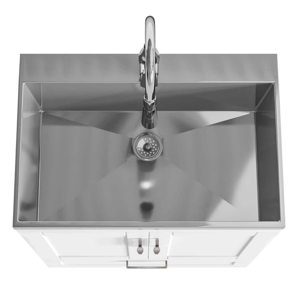 Q: Can this unit handle heavy-duty cleaning tasks? A: Yes, the stainless steel sink is designed for heavy-duty use with a deep basin and pull-out spray faucet to handle all your cleaning jobs.