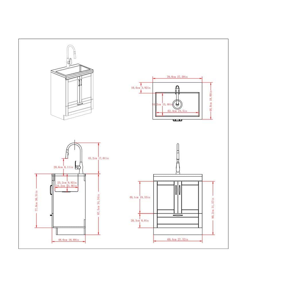 Q: What are the dimensions of this utility sink? A: The entire unit measures 27.6 inches wide, 18.9 inches deep, and 34.4 inches high, making it compact yet functional.