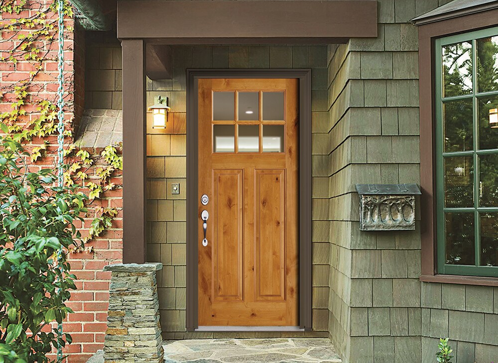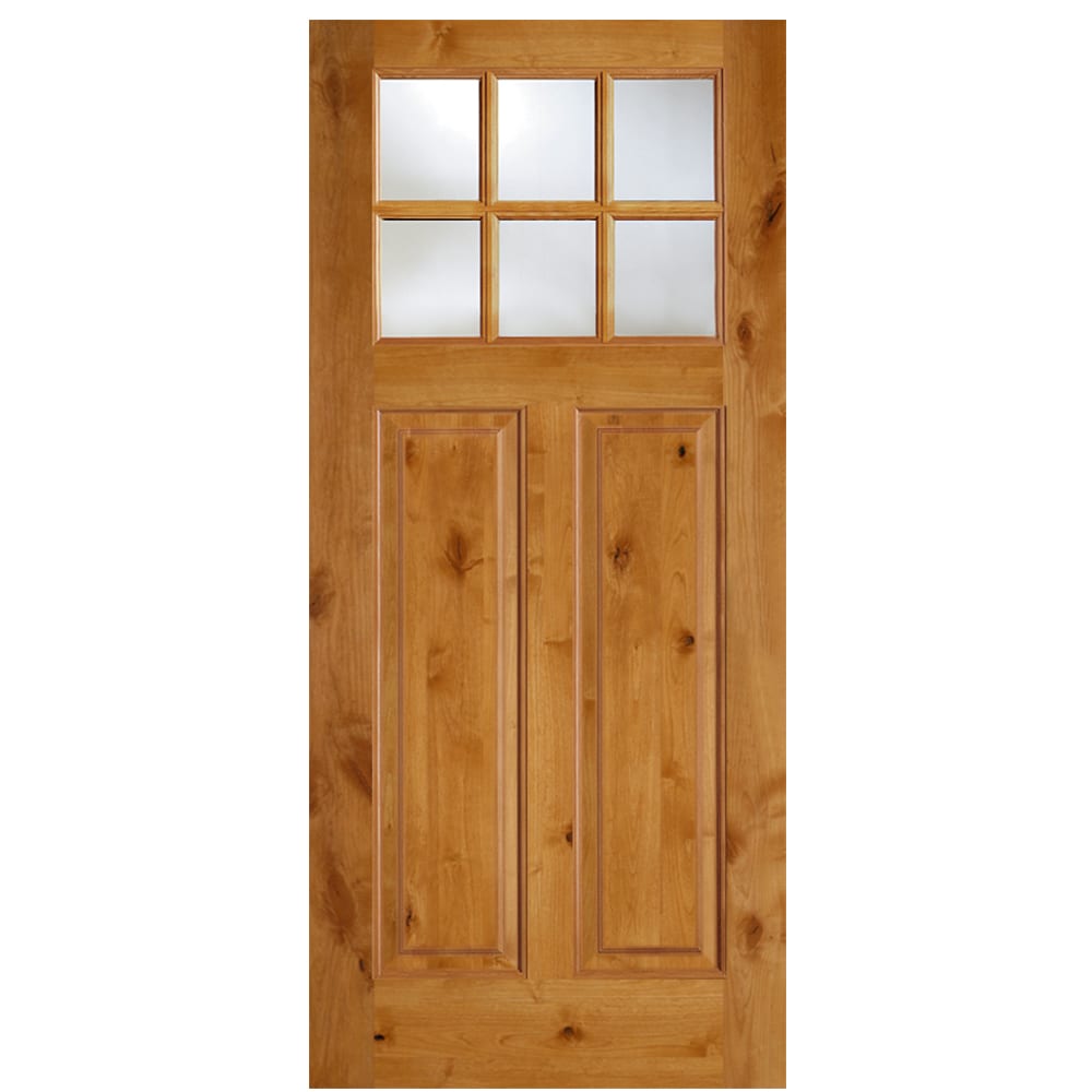 Enhance the exterior of your home with the SIMPSON 36-in x 80-in Unfinished Wood Front Door, featuring a beautiful clear glass pane. Crafted from knotty alder wood, this door combines the durability of maple with the rustic charm of pine. Ready to paint or stain, it's perfect for creating a customized look.