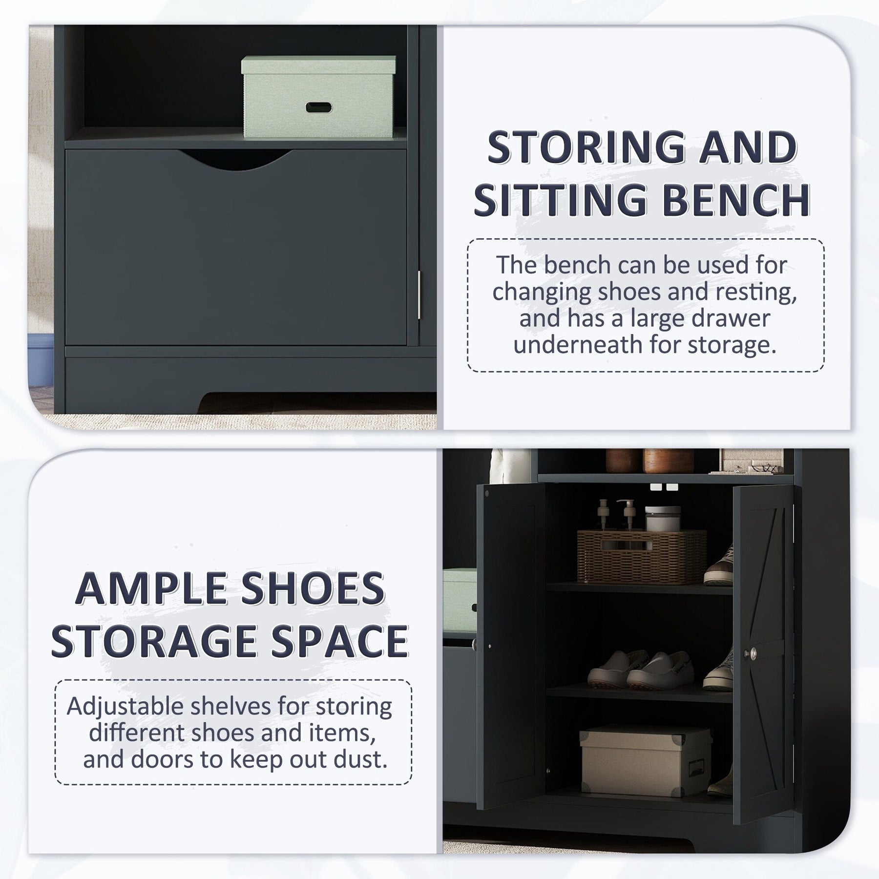 Transform your entrance with the SINOFURN Antique Blue Hall Tree, offering both style and substance. Designed with a bench, cabinet, shelves, and hooks, this hall tree provides comprehensive storage while seamlessly enhancing your home's aesthetic. Crafted from MDF and particleboard, it combines durability with a timeless design.