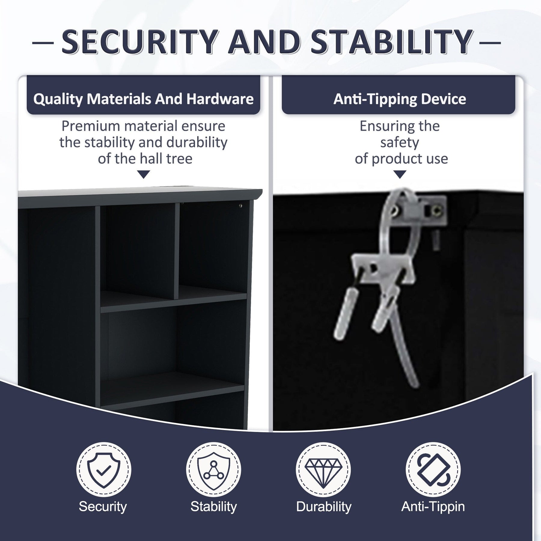 Q: How does the anti-tipping device work? A: The anti-tipping device secures the hall tree to the wall, preventing it from tipping over and ensuring safety, particularly in homes with children or pets.