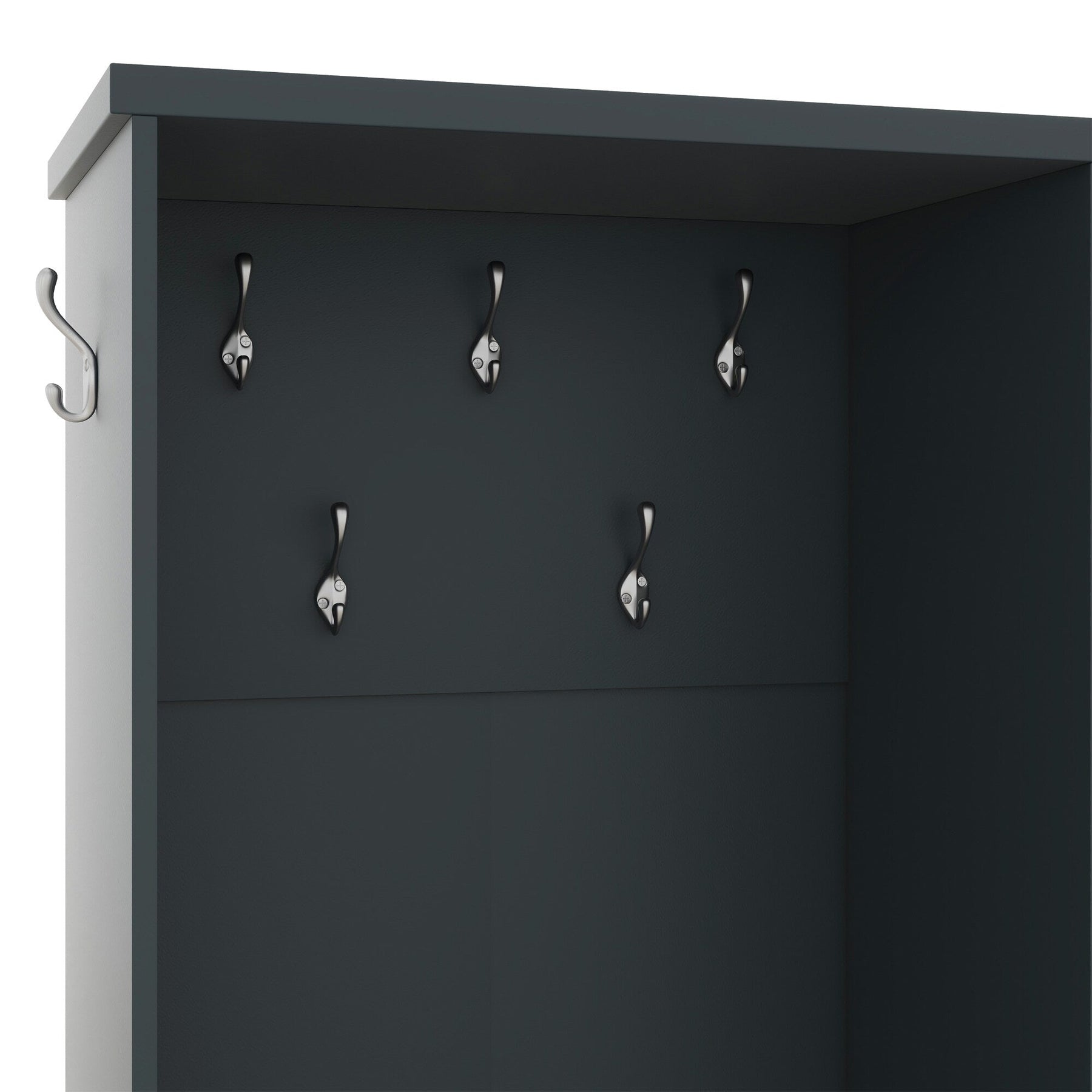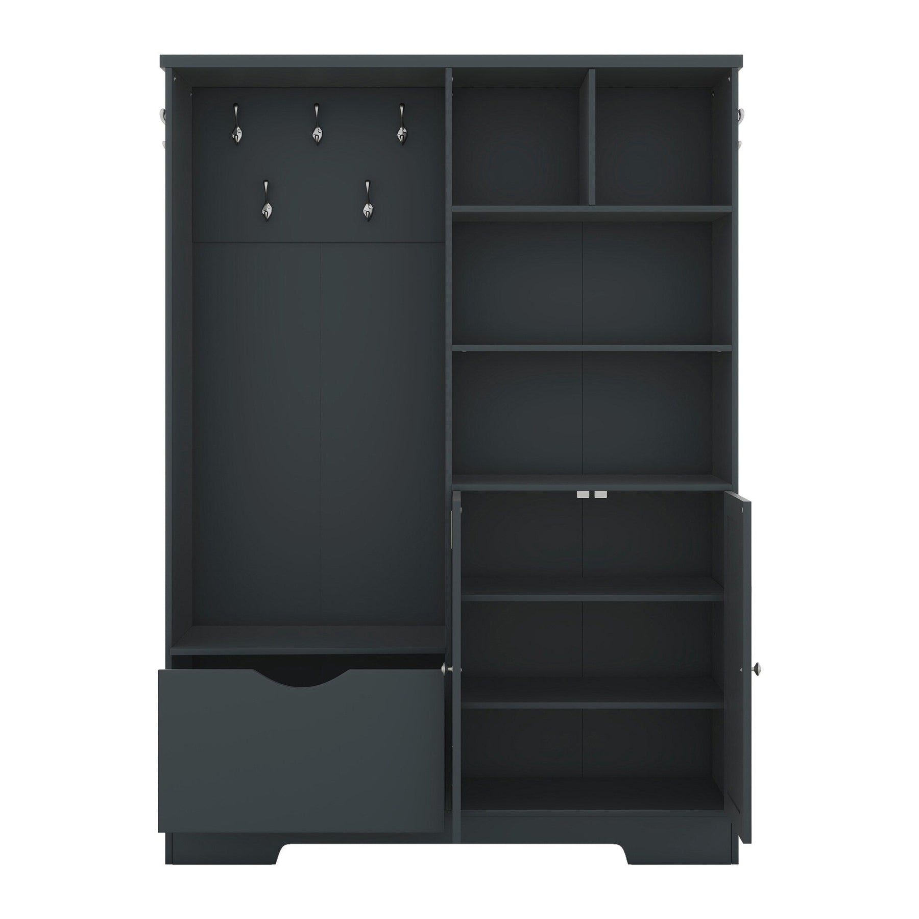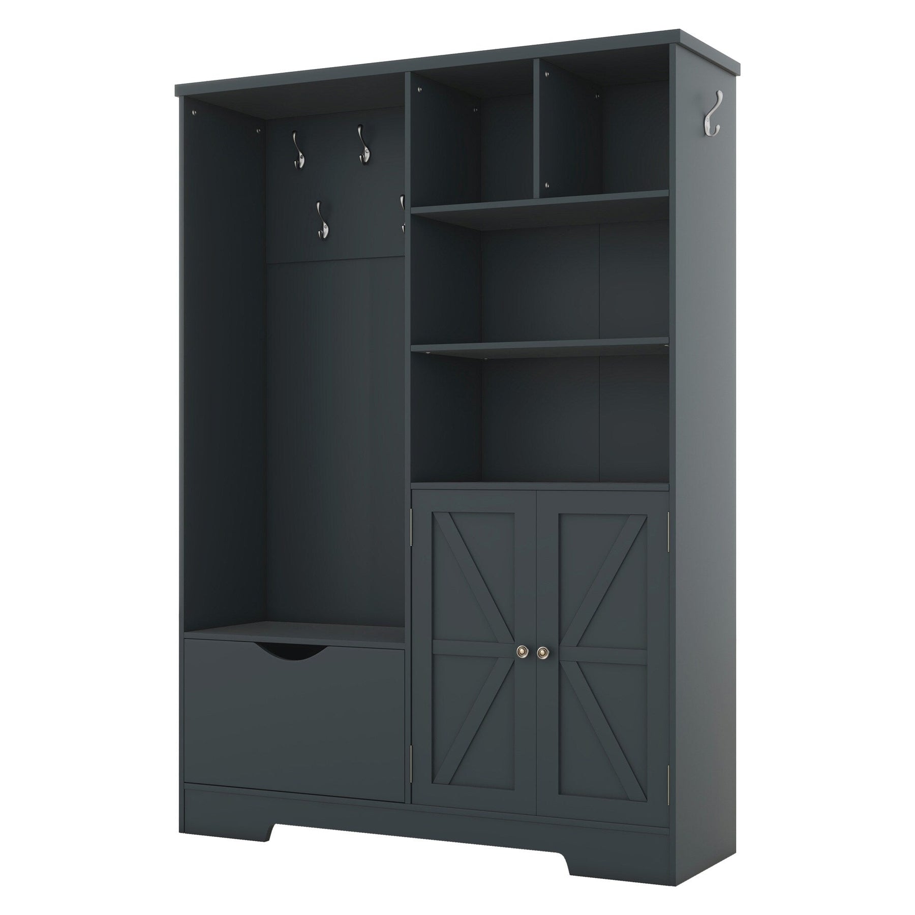 Storage: Features one large shoe cabinet, one large drawer, four shelves, and five hooks for ample organization.