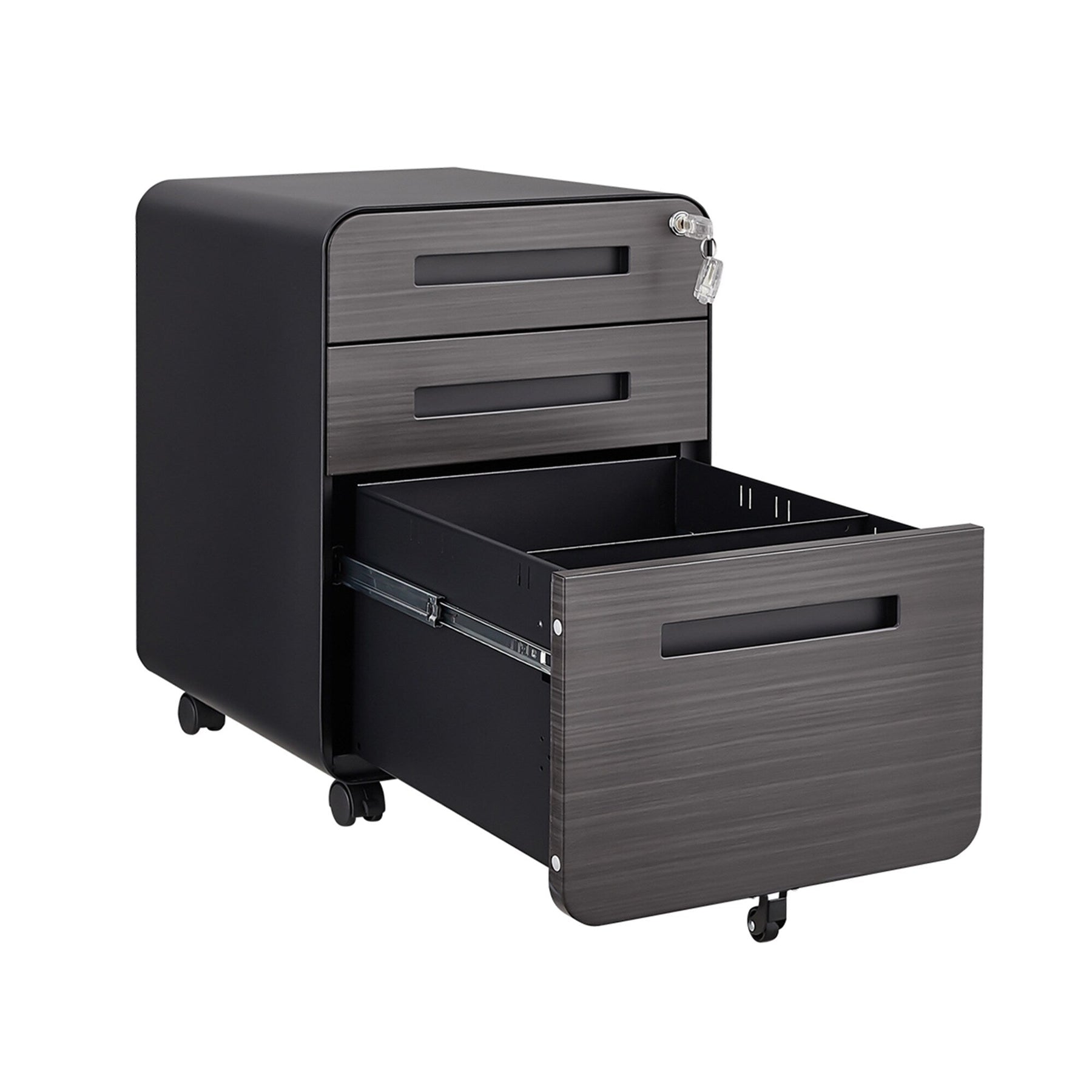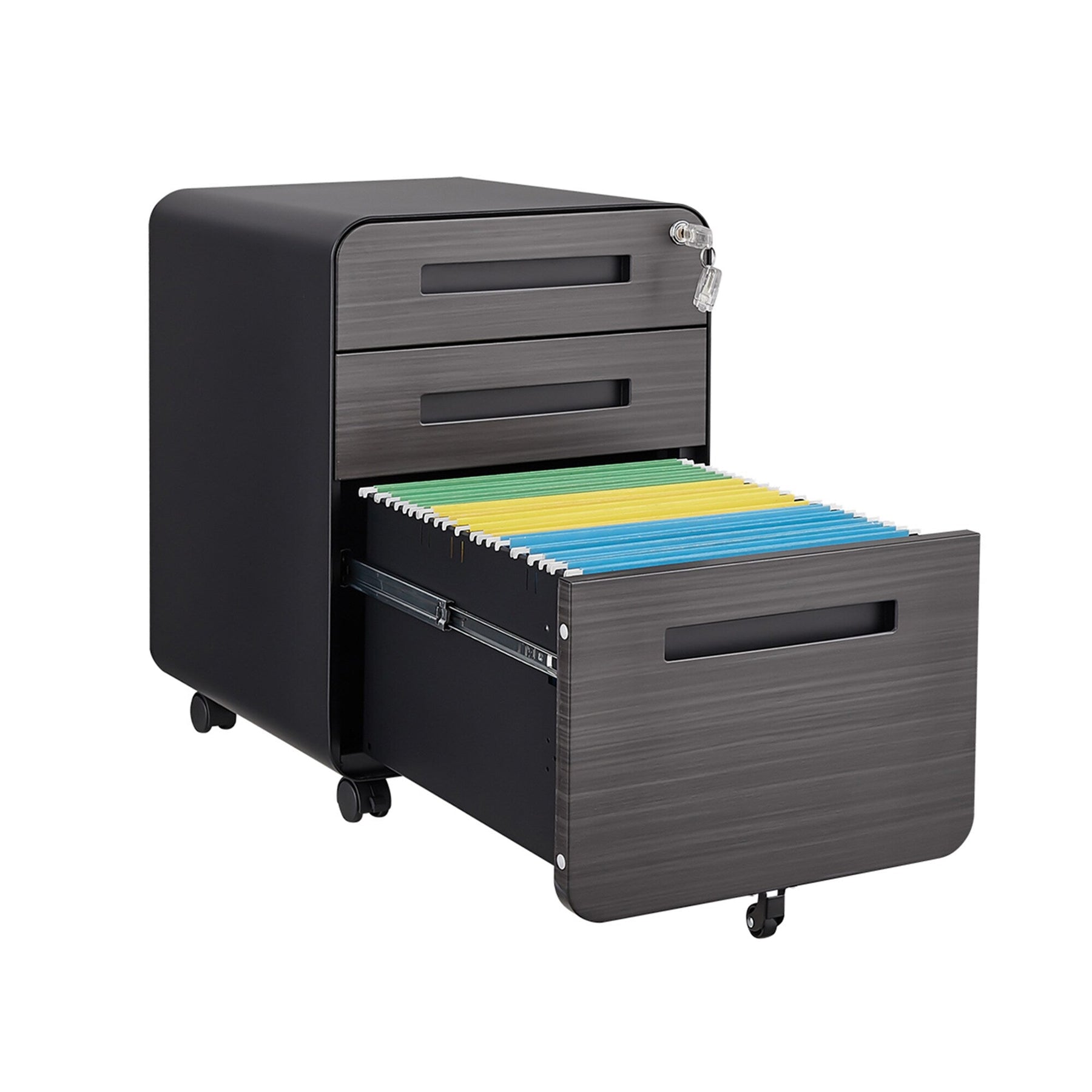 Q: Is the cabinet fully lockable? A: Yes, a single lock secures all three drawers for added security, and two keys are included.