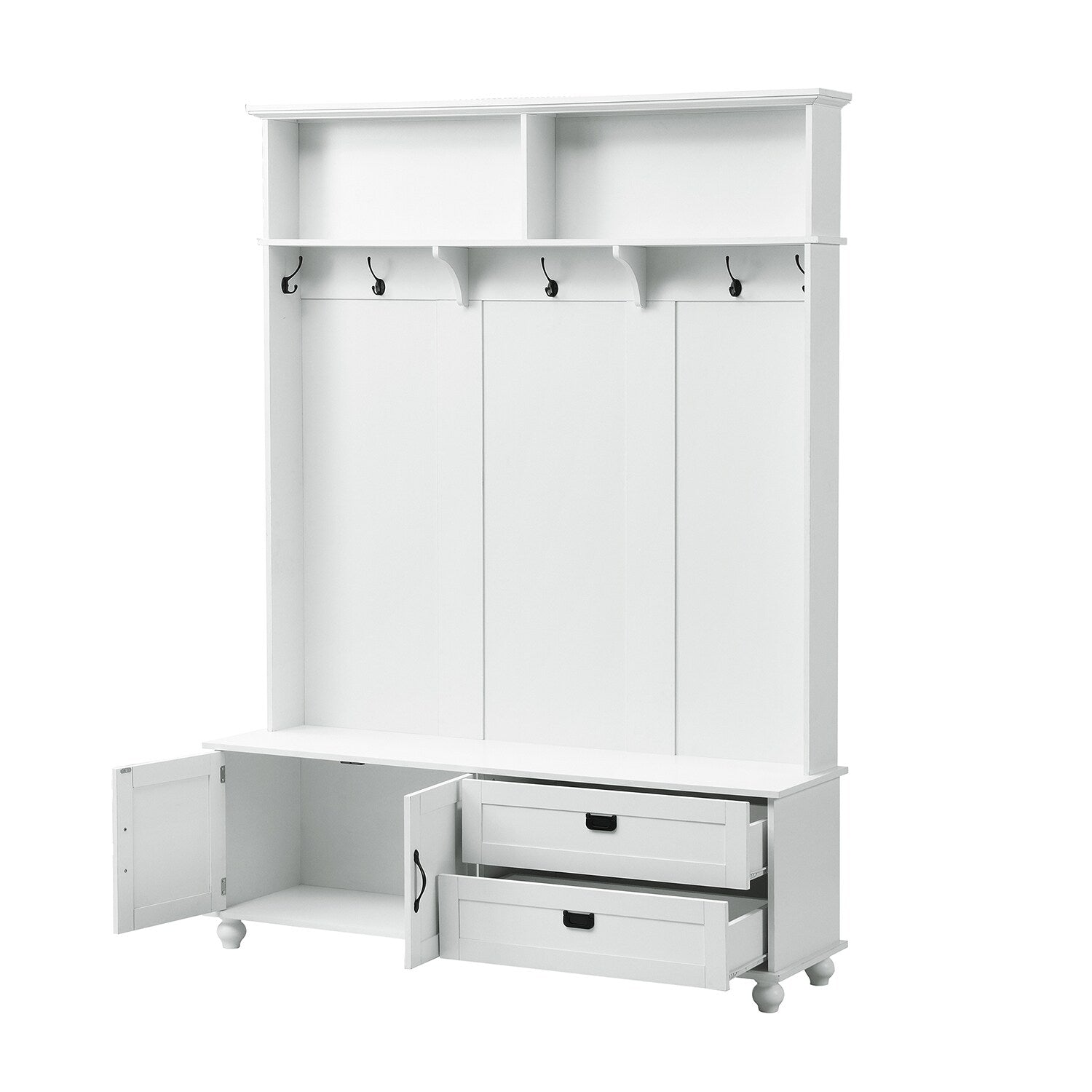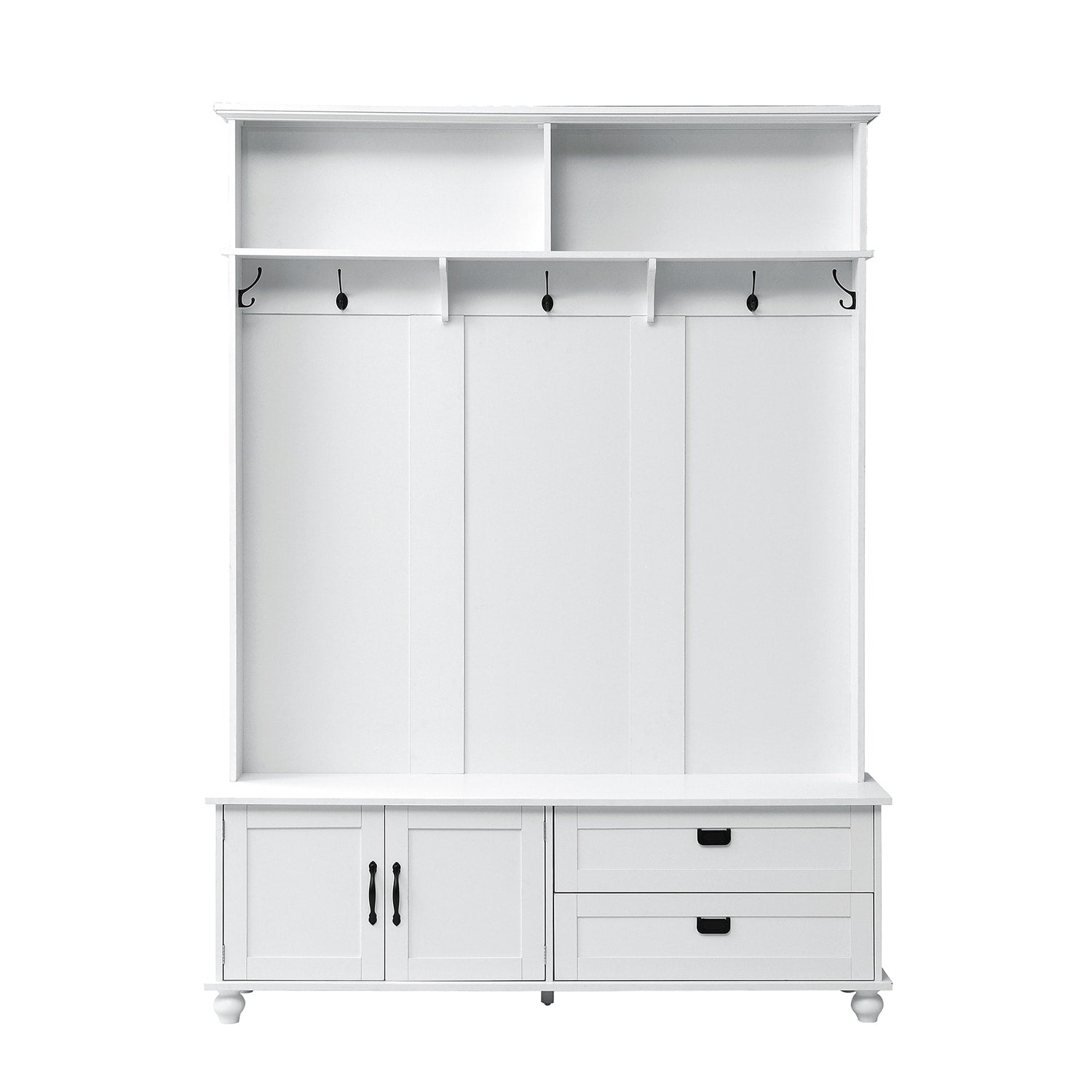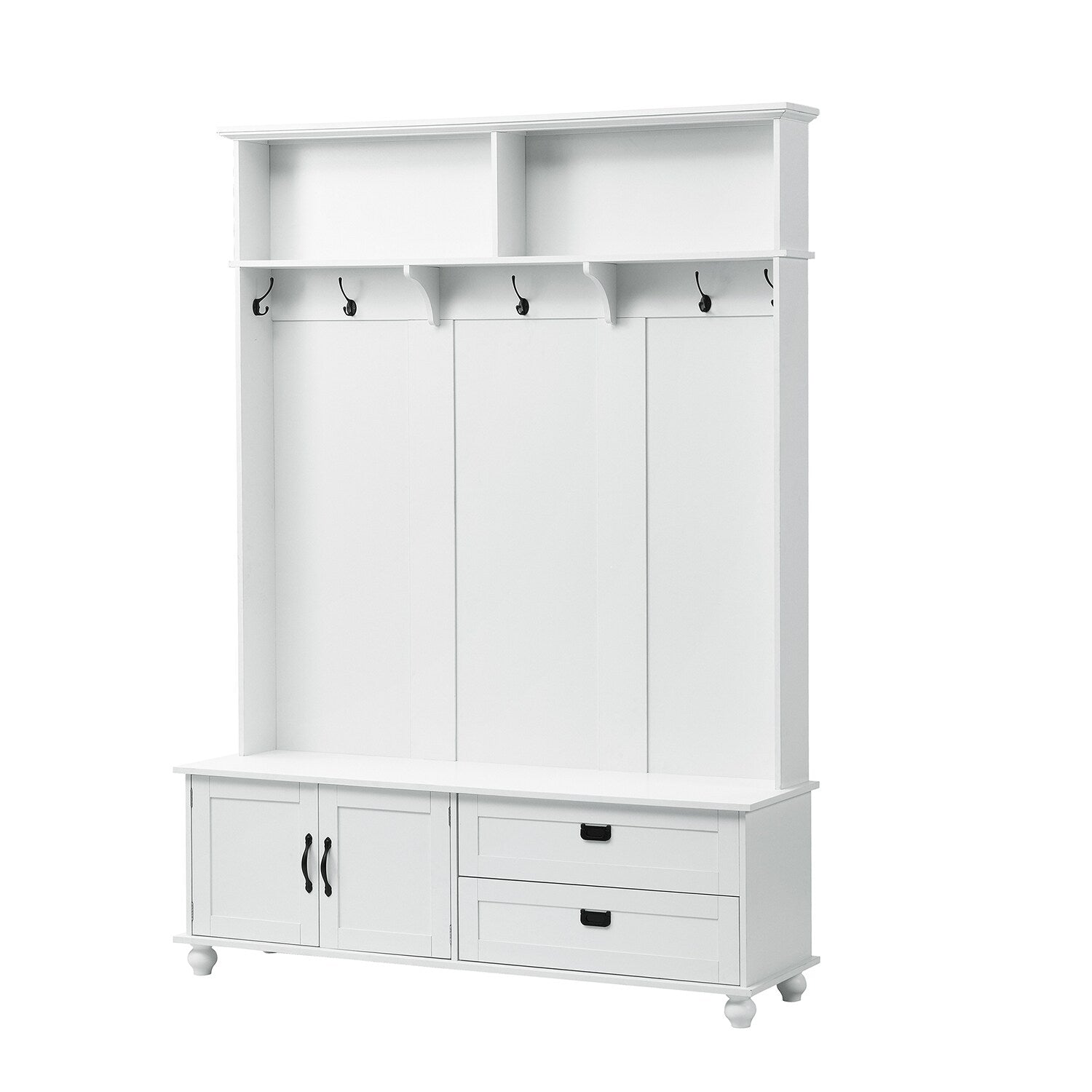 Enhance your entryway with the SINOFURN Country 59-in White Wood Hall Tree, a perfect blend of style and functionality. Crafted from sturdy particleboard with a sleek white finish, it offers ample storage for your everyday essentials while doubling as a comfortable seating area.