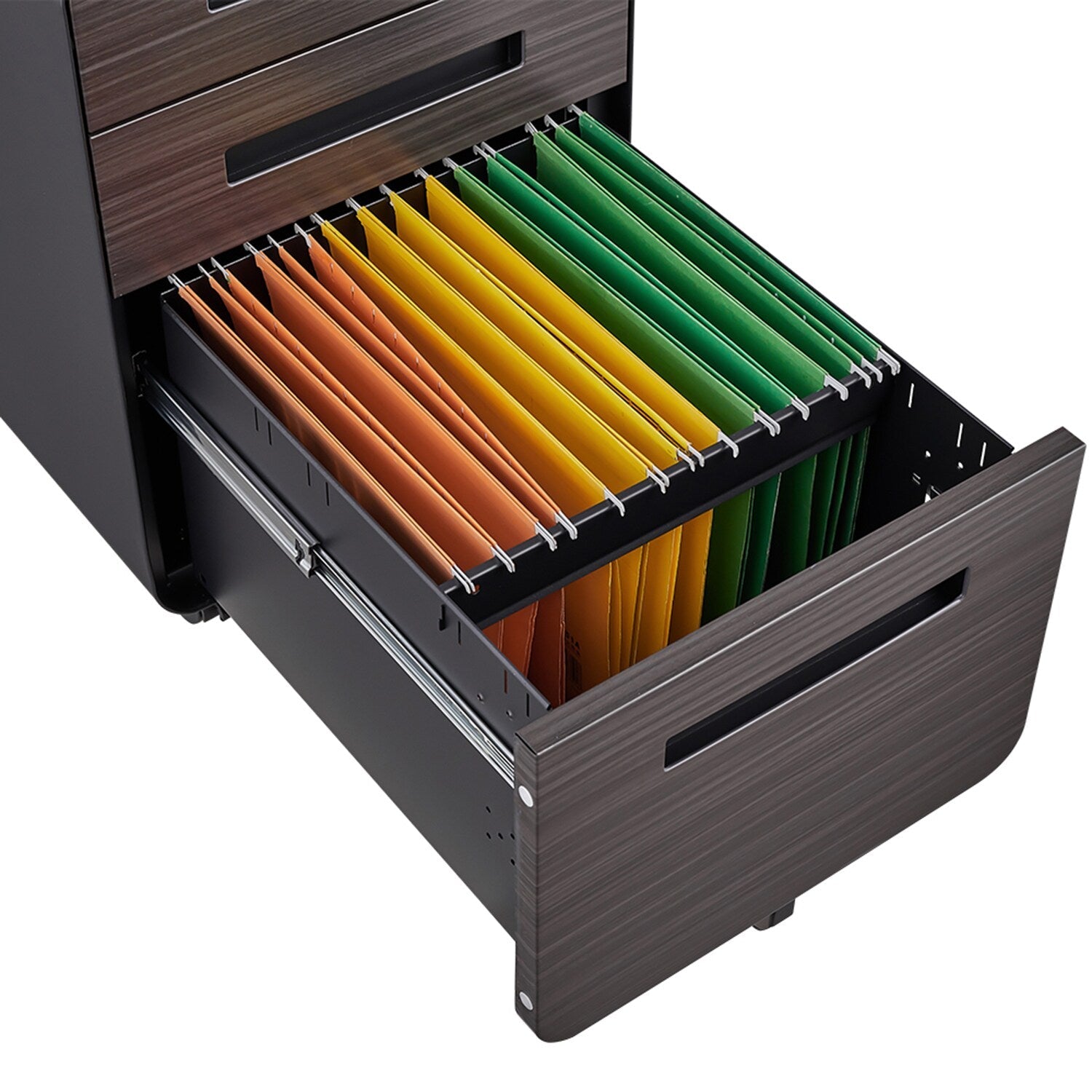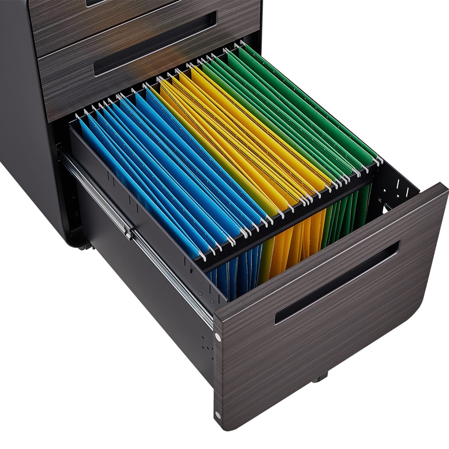 Q: What material is used in the construction of the cabinet? A: This file cabinet is made from powder-coated steel, enhancing its durability and modern finish.