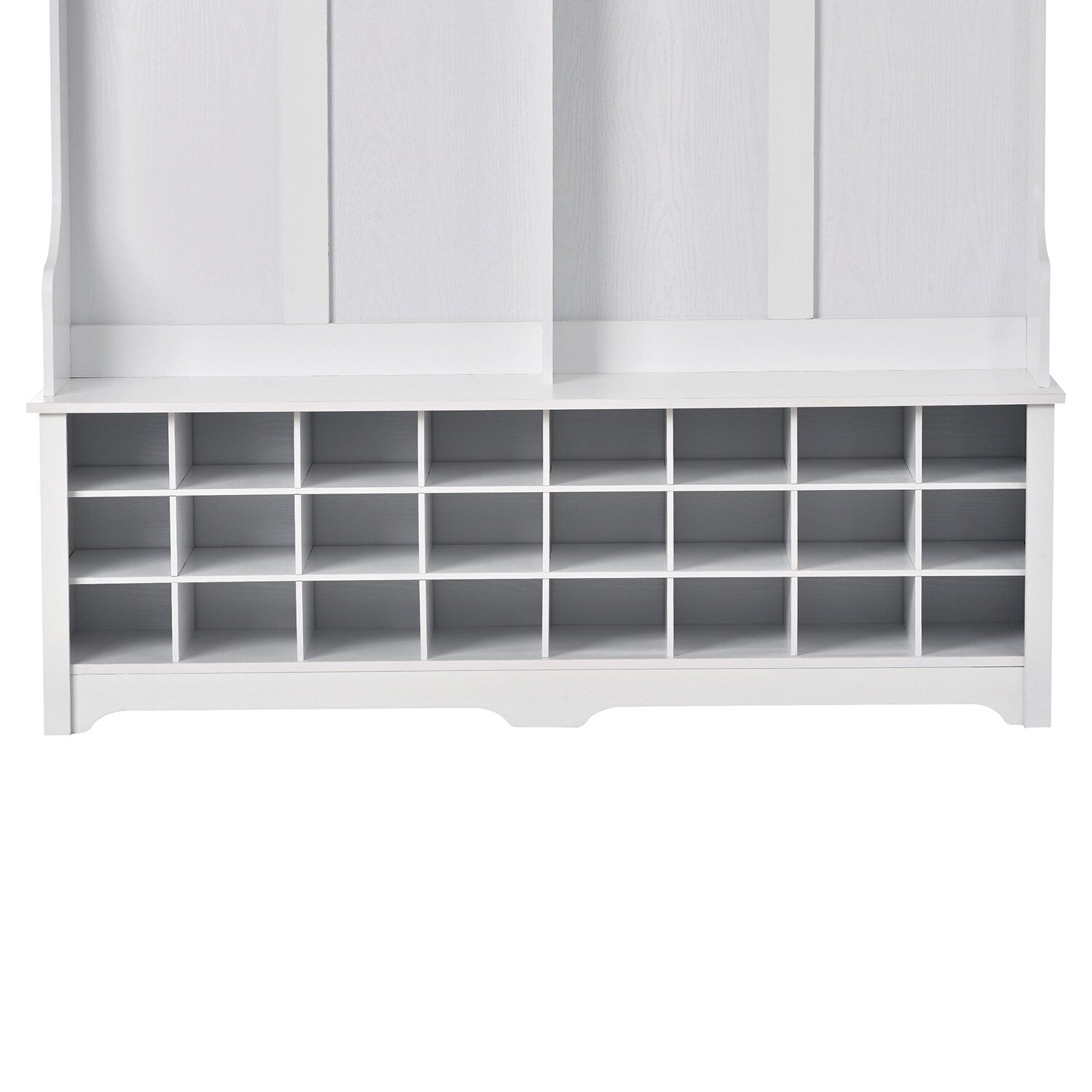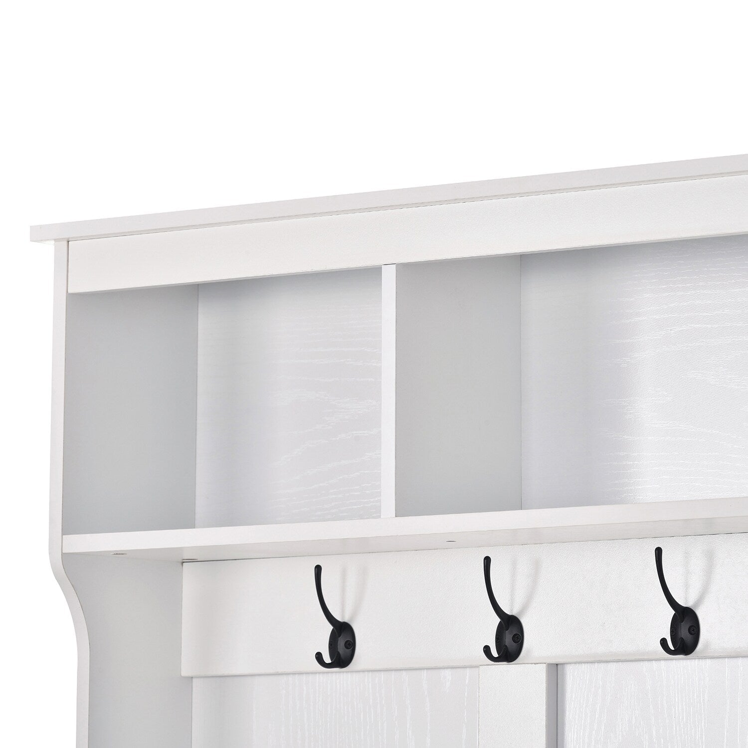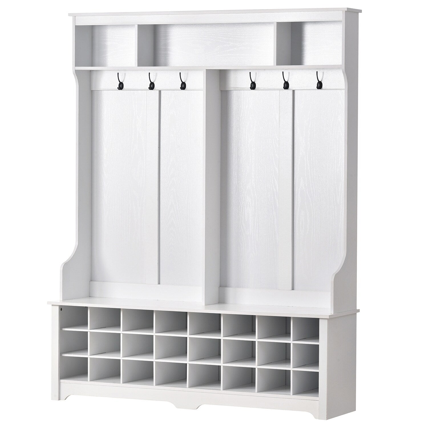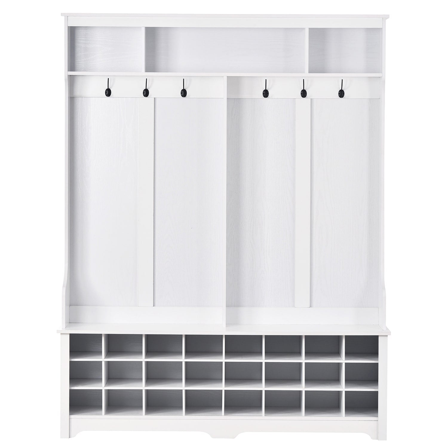 Storage: Features 24 individual shoe cubbies, three upper compartments, and six metal hooks for various storage needs.