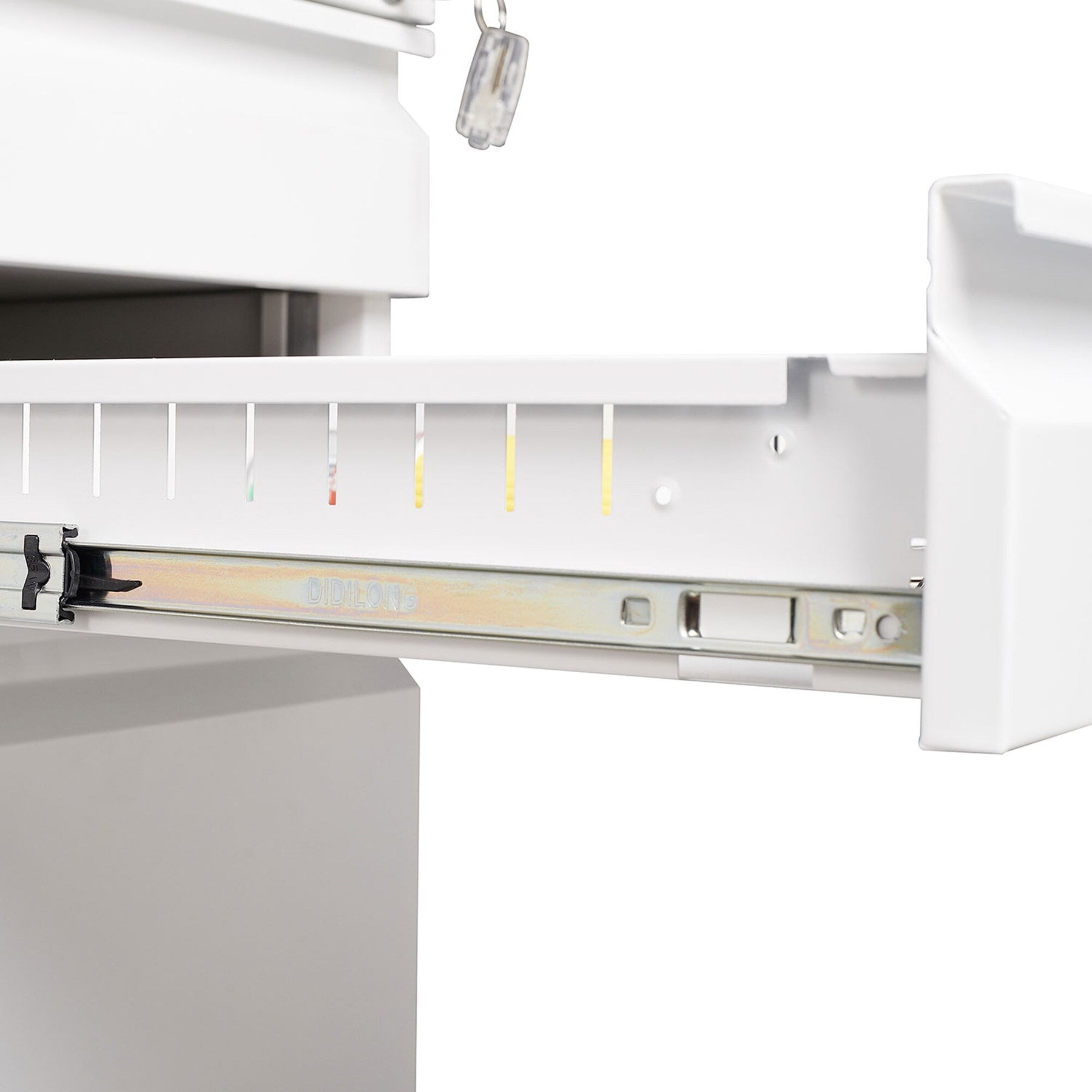 Q: What materials are used in this filing cabinet? A: This file cabinet is made from durable metal with a sleek, modern white finish, ensuring longevity and style.