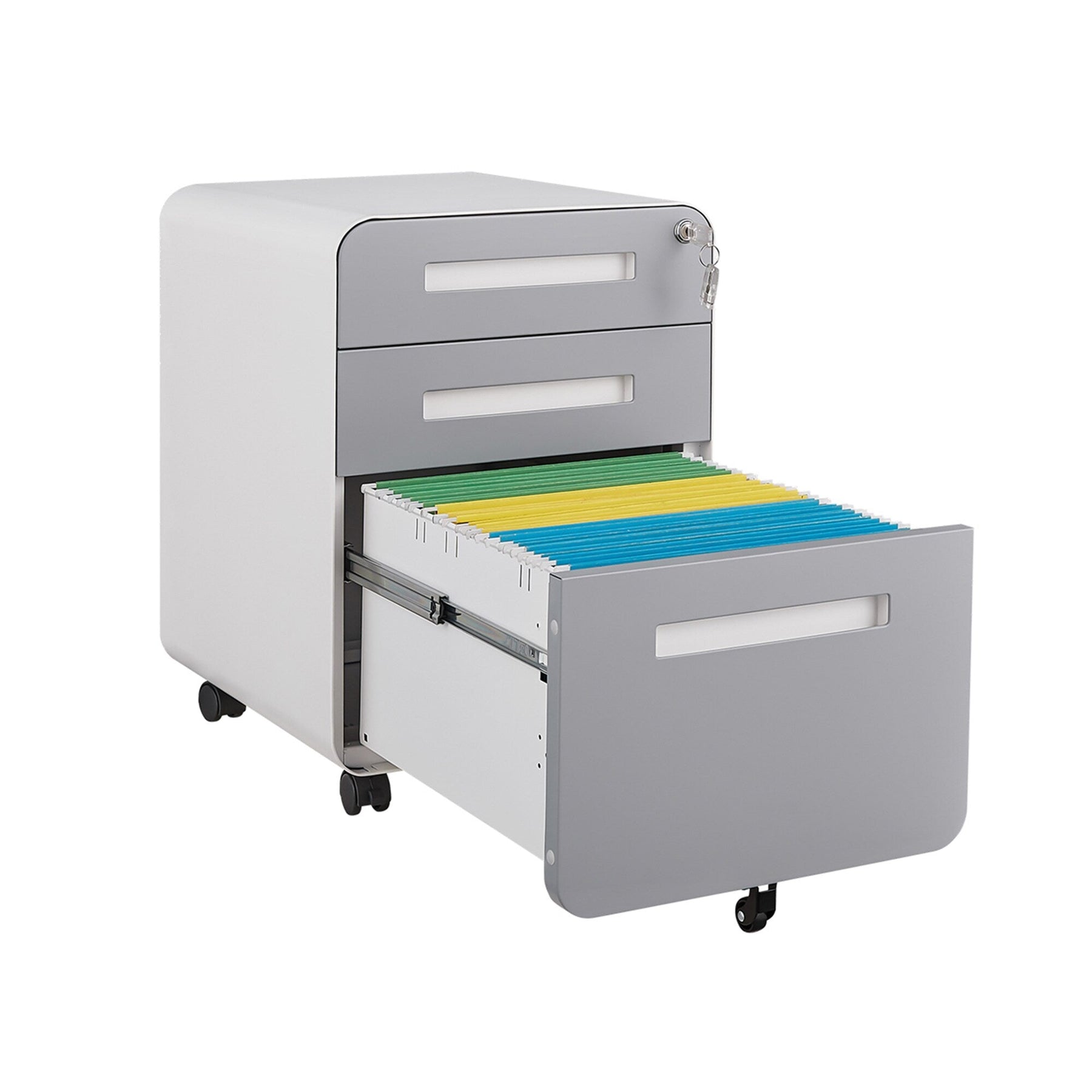The SINOFURN White+Gray 3-Drawer File Cabinet is a compact storage solution designed for both style and efficiency. Its sturdy powder-coated steel construction ensures it can double as a printer stand, supporting up to 330 lbs. Equipped with full-extension glides and a secure locking system, your documents are easily accessible yet safe.