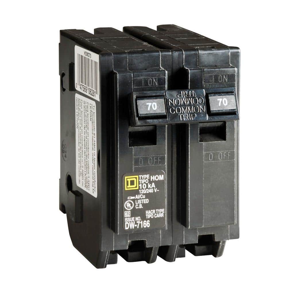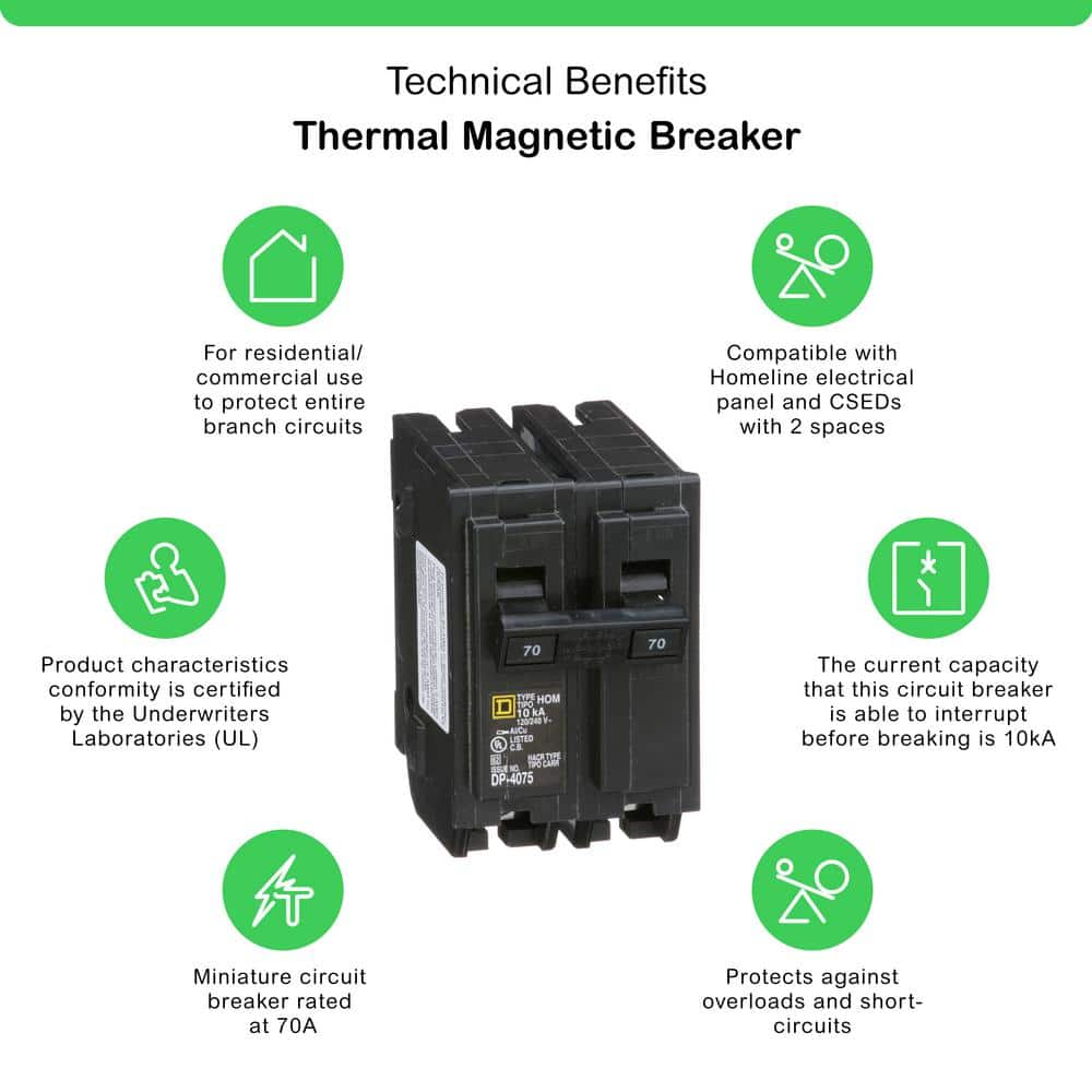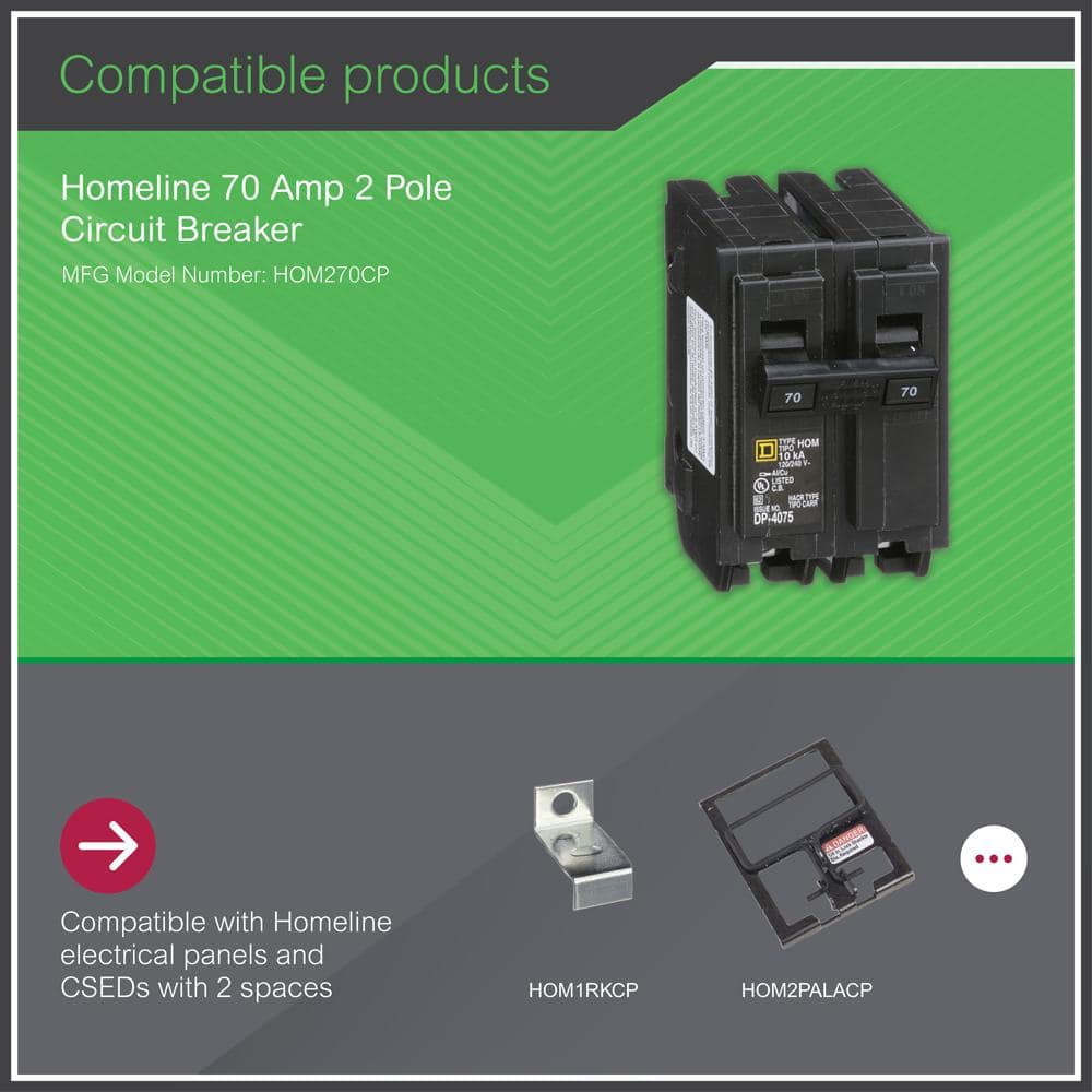 The Square D Homeline 70 Amp 2-Pole Circuit Breaker provides reliable overload and short-circuit protection for residential electrical systems. Compatible with both Homeline load centers and CSEDs, this ANSI-certified and UL-listed breaker ensures high performance with a 10,000 AIR rating. Its plug-on design allows for quick and easy installation, making it a trusted choice for home professionals.