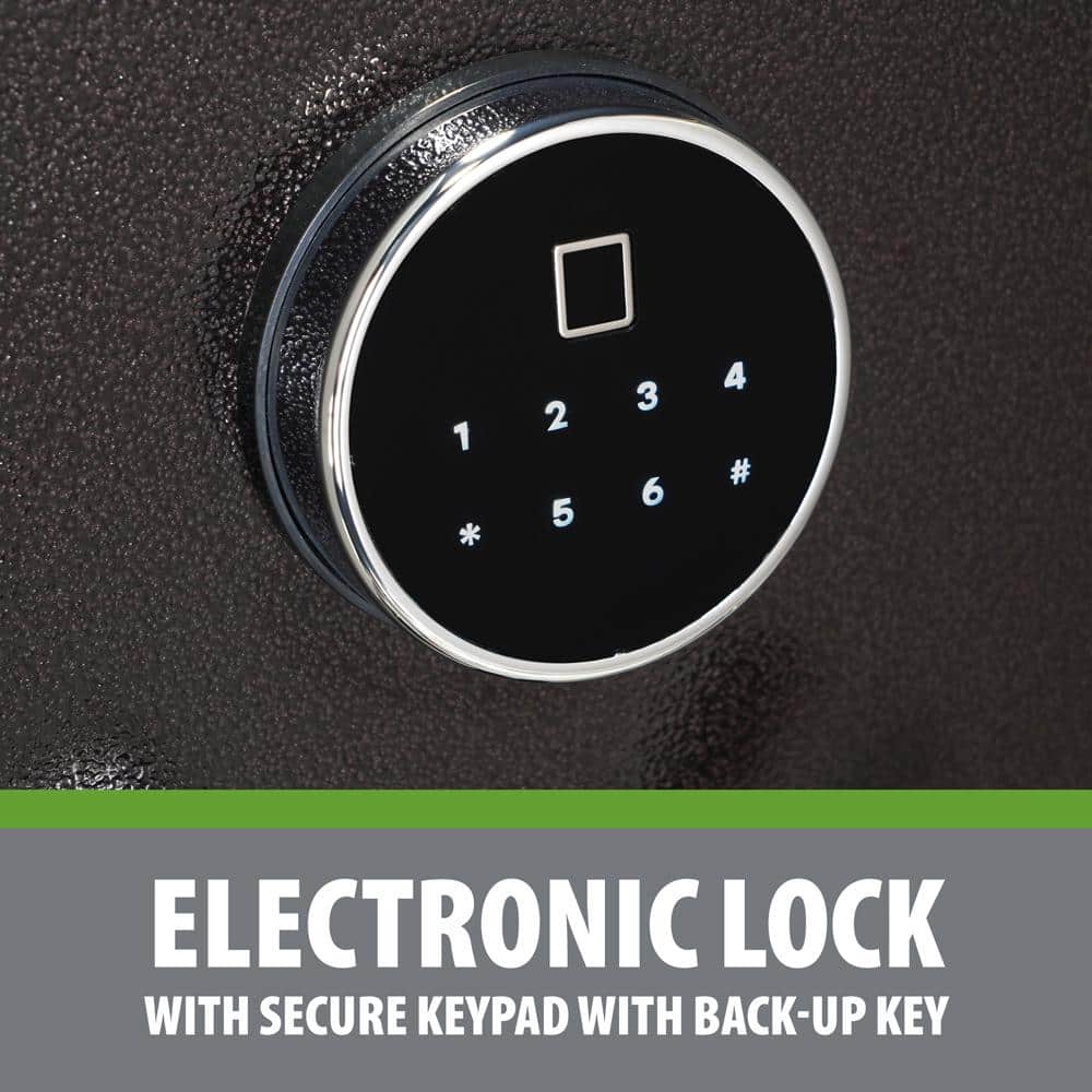 A: Apart from fire and water resistance, the safe features a robust locking system with electronic, biometric, and keyed options, an anti-drill plate, and numerous steel locking bolts.