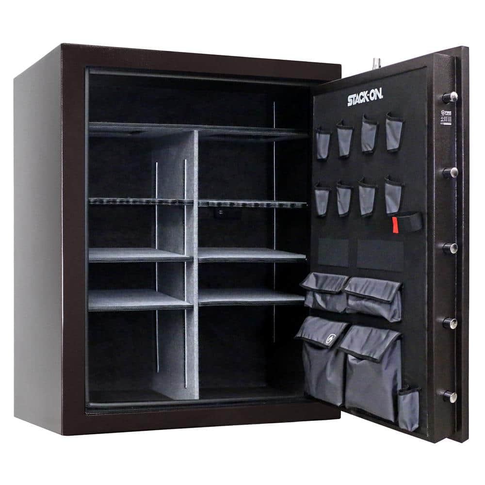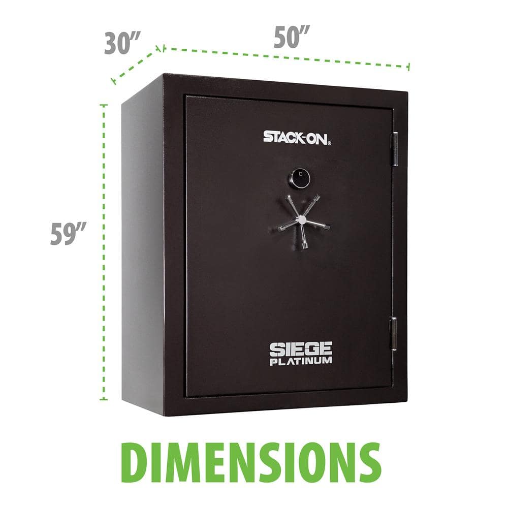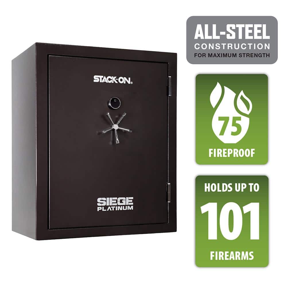 The Siege Platinum 101-Gun Safe by STACK-ON combines unmatched security with elegant design. Fire-resistant up to 1200 degrees for 75 minutes and water-resistant for 7 days, it offers comprehensive protection for your firearms and valuables. With electronic, biometric, and keyed locking systems, this safe is a fortress of peace and trust.