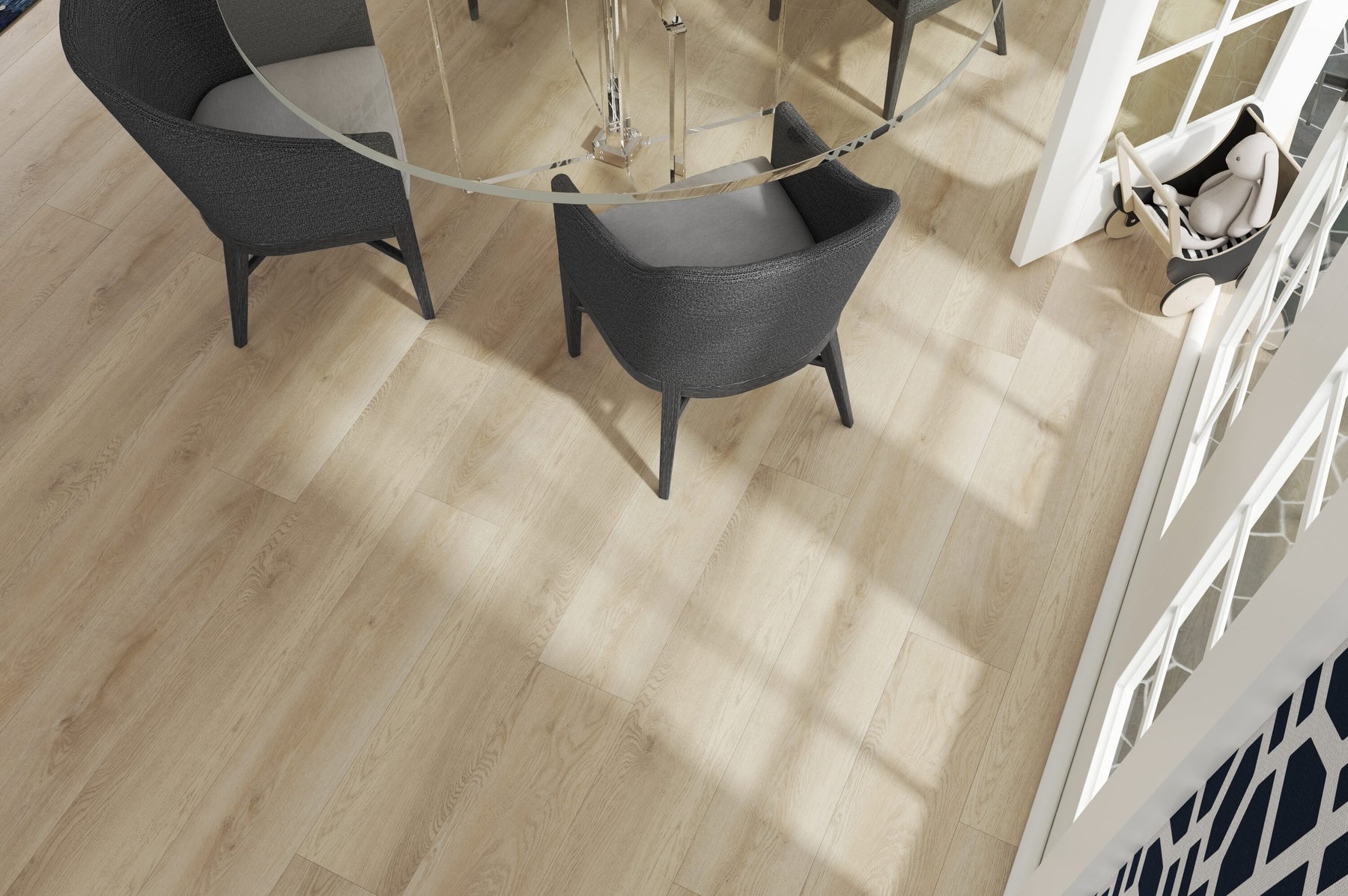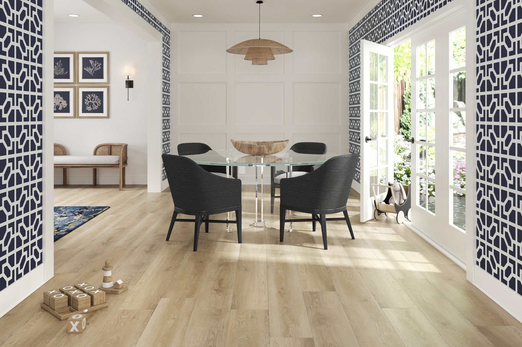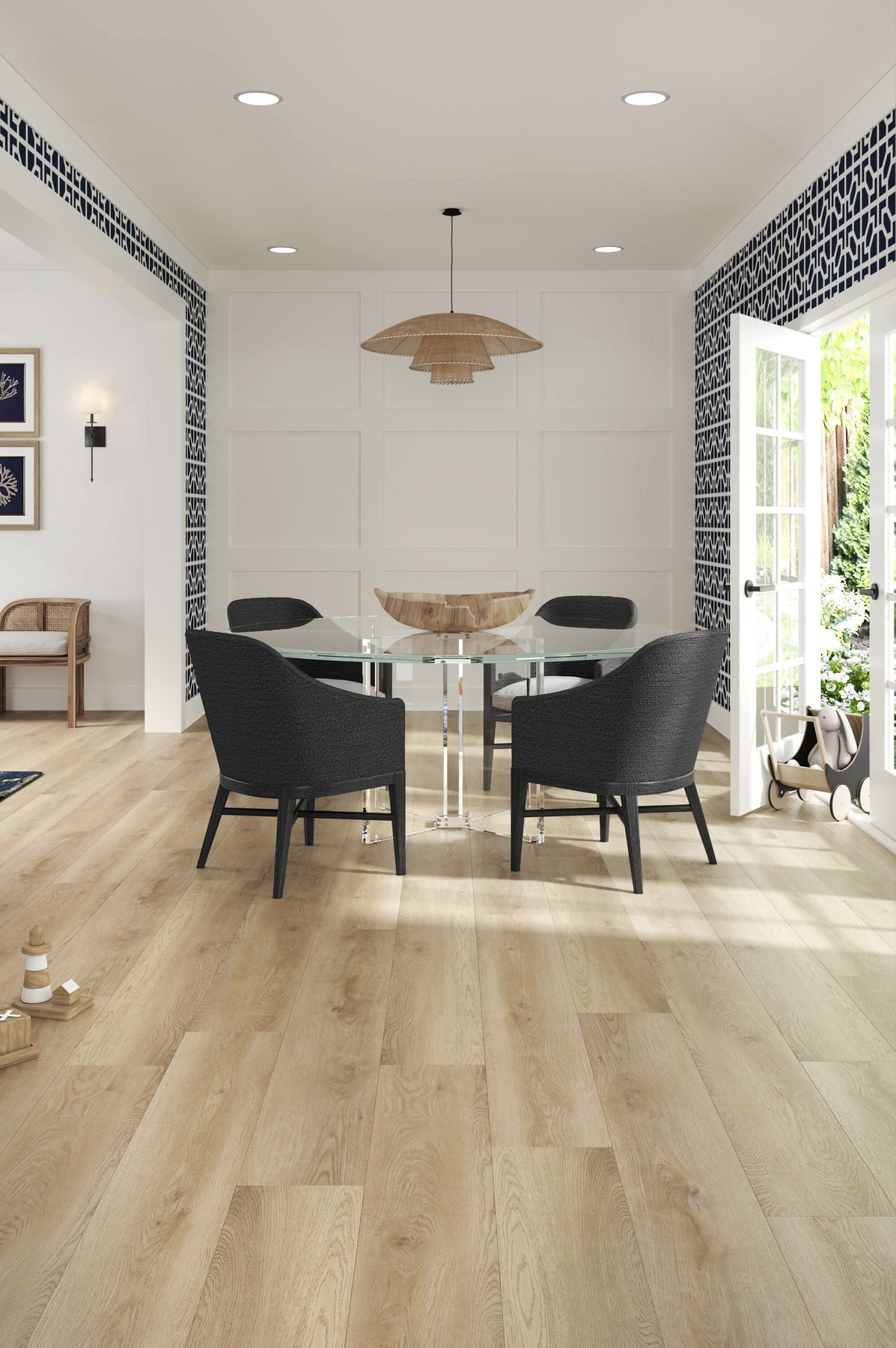Aubrey Oak bathes a room in soft, golden light, echoing the breezy charm of coastal oak. The extra-wide visual and natural grain create an expansive, serene foundation that elevates modern and traditional settings alike. Style it with woven textures and crisp blacks for a tailored contrast, or layer plush neutrals for chic calm. This luminous plank is the quiet luxury essential your space has been waiting for.
