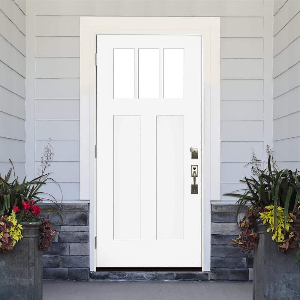 Energy-efficient fiberglass prehung front door with three toplite clear glass panels and a durable composite frame. Right-hand outswing design arrives primed white and ready to paint, offering low maintenance and long-lasting performance for any climate.